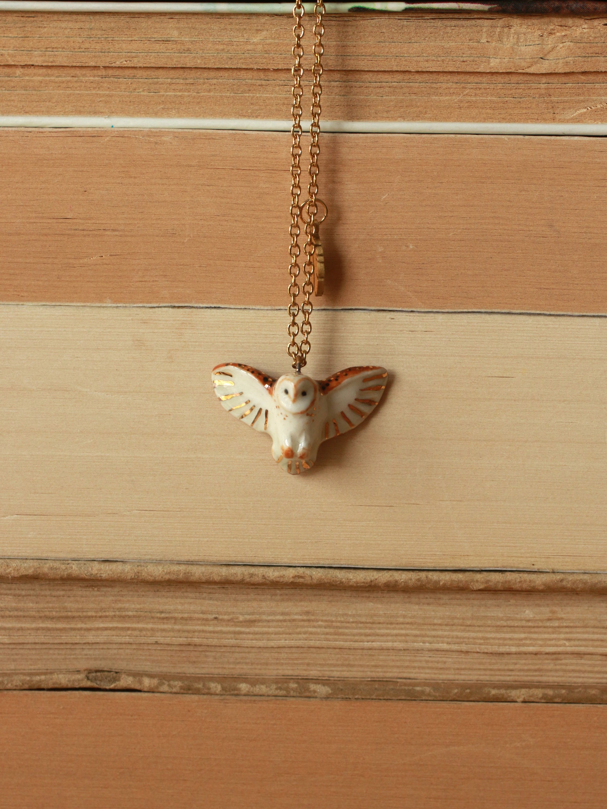 One of a kind ceramic barn owl necklace with a tiny feather charm