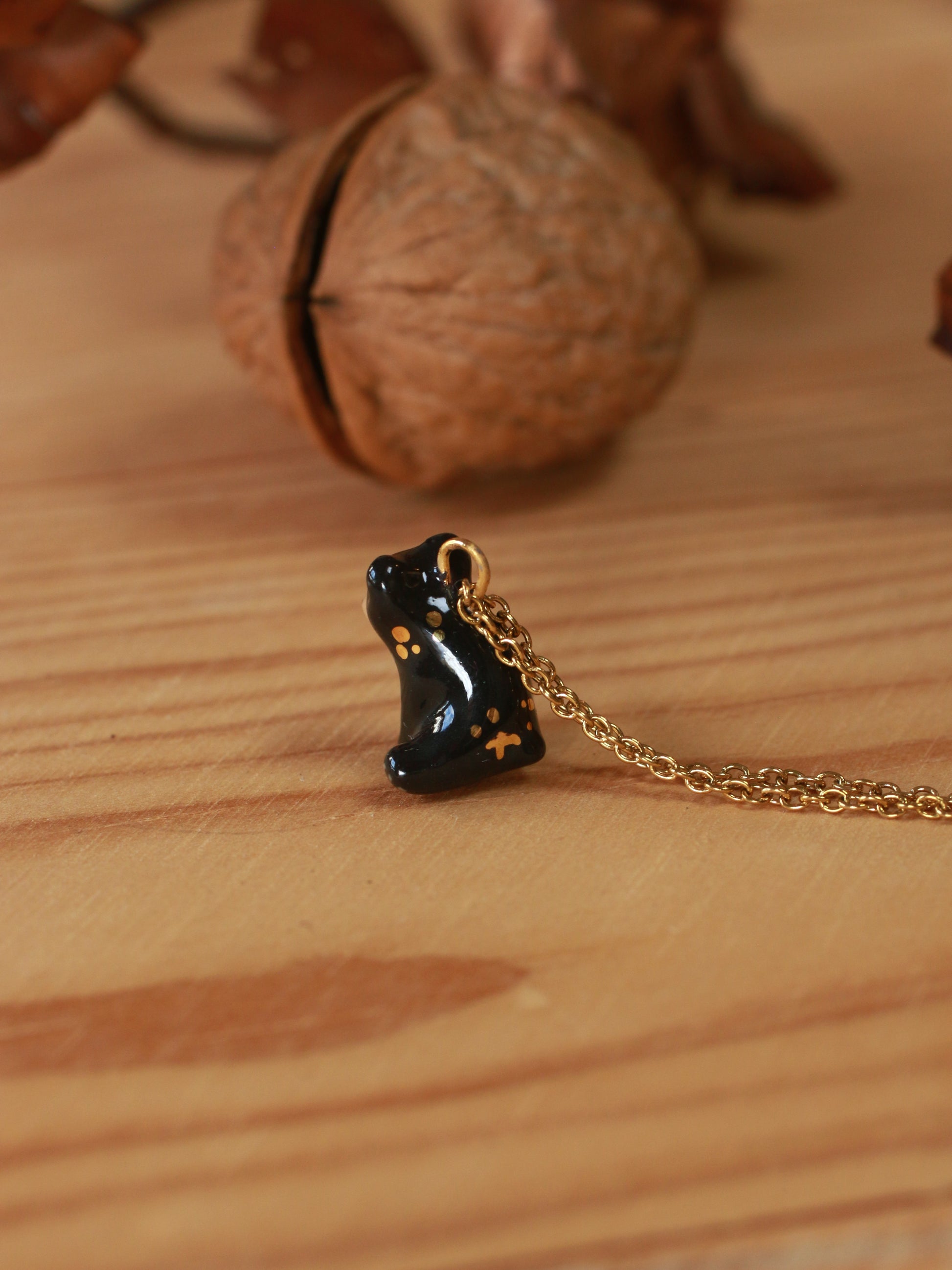 One of a kind ceramic black bear necklace - in a walnut box