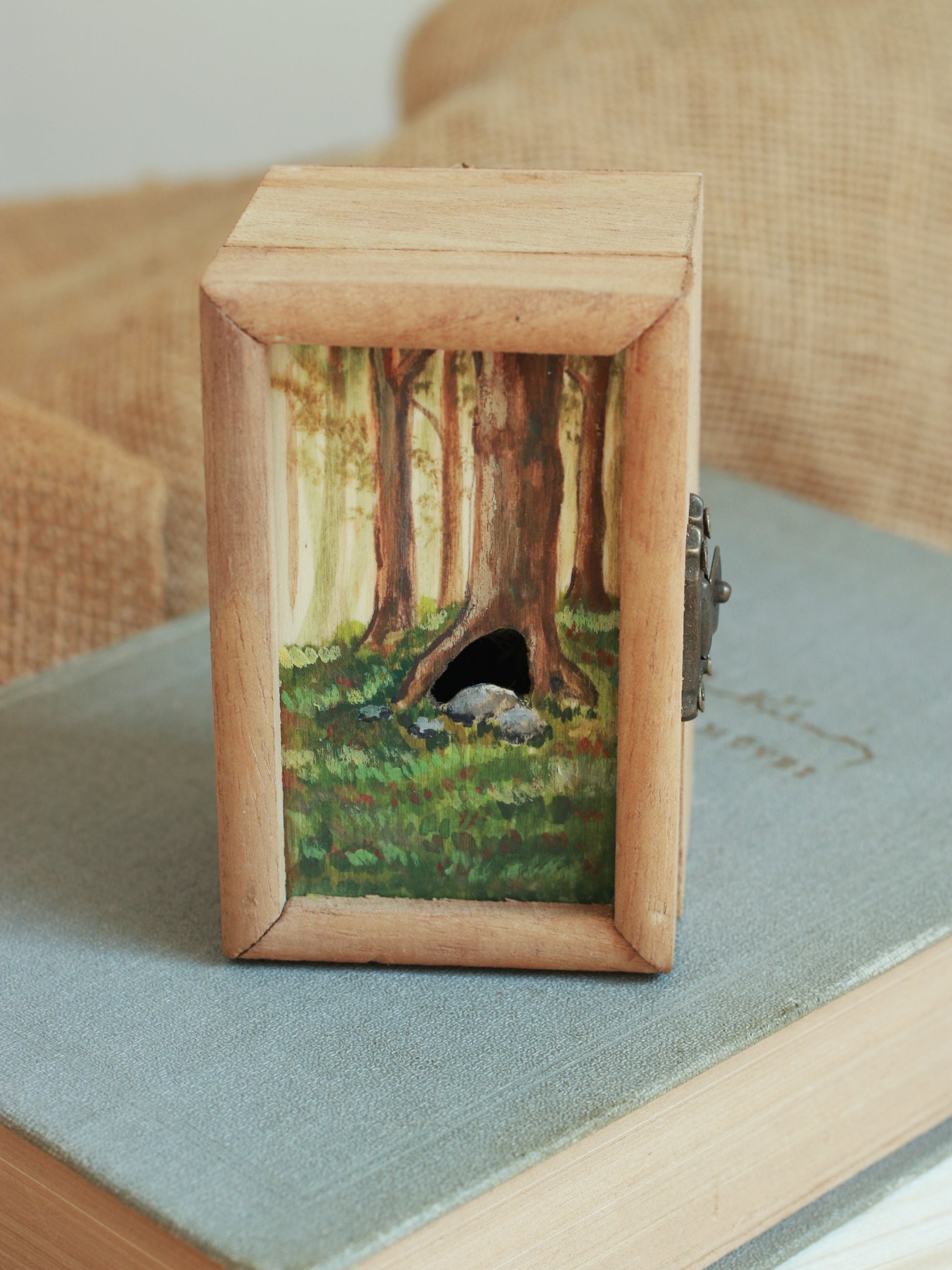 Hand-painted wooden box / with a hidden hedgehog nest inside