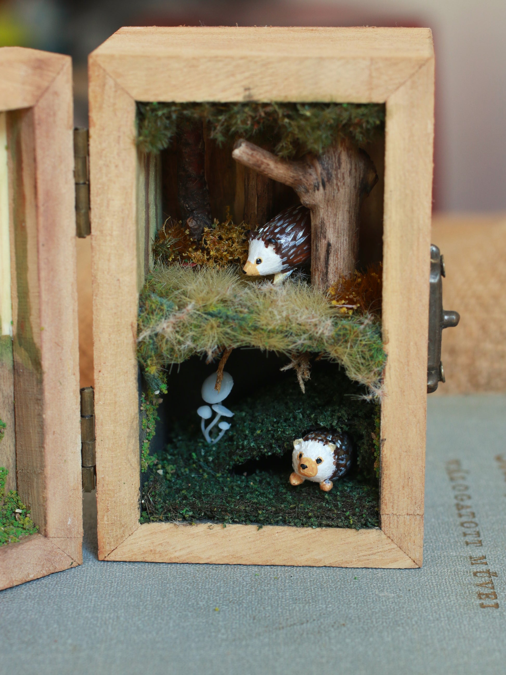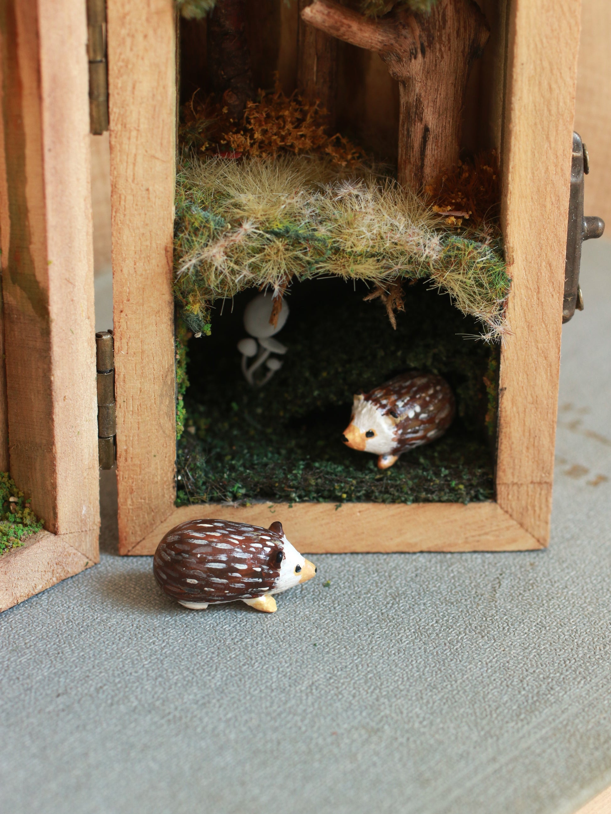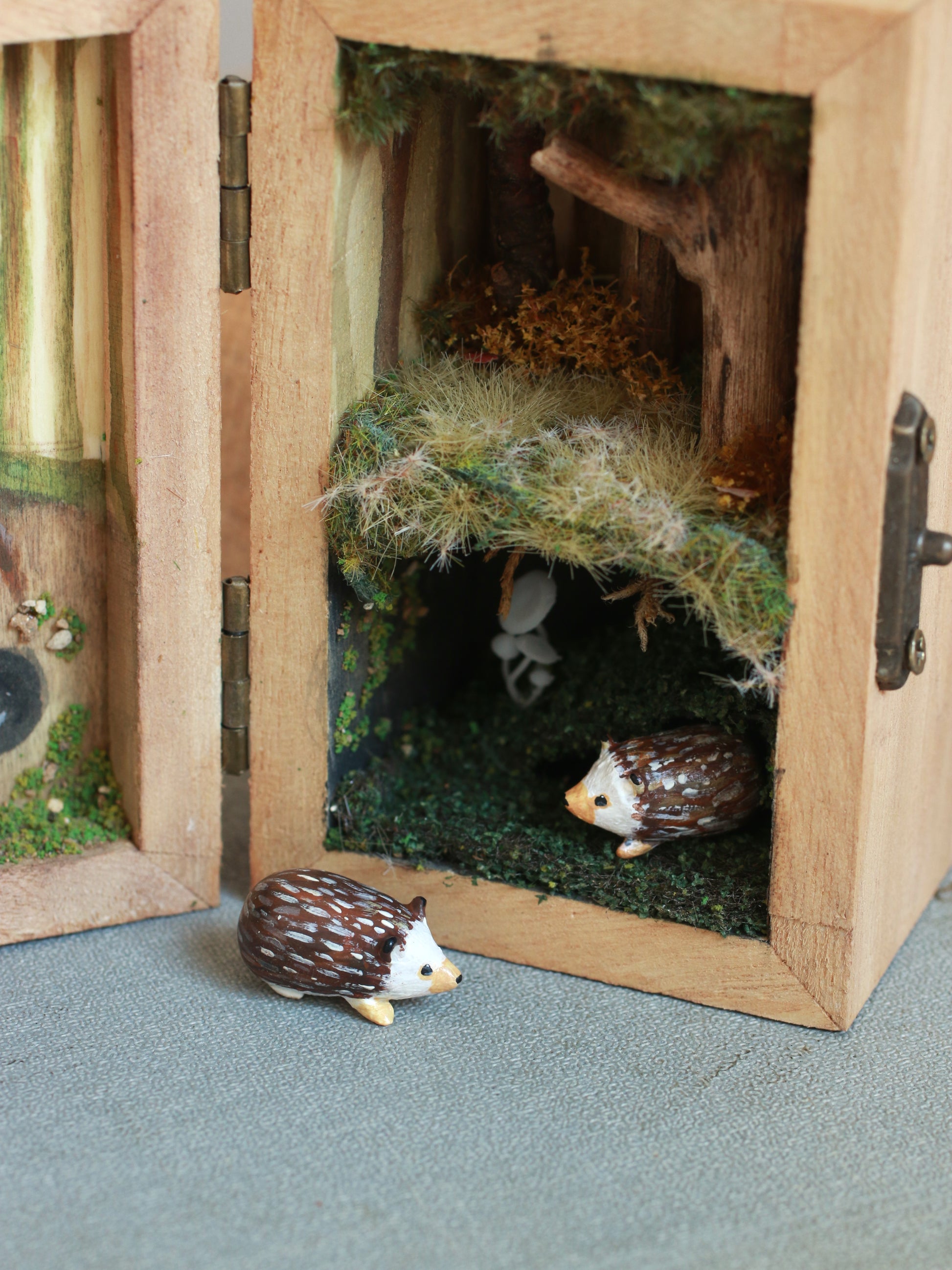 Hedgehogs nest shadow box - Hedgehog family in a hand-painted open-able wooden box