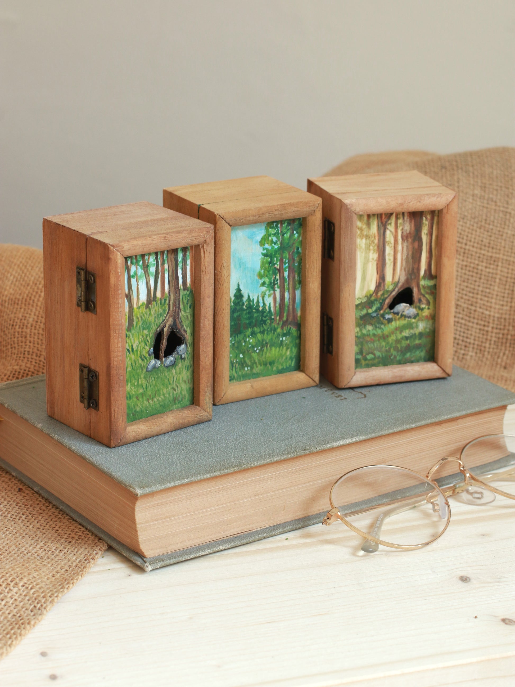 â–¸It is an open-able box made of wood, hand-painted by me. With polymer clay mushrooms and real wood, tiny stones, and fake grass, moss.