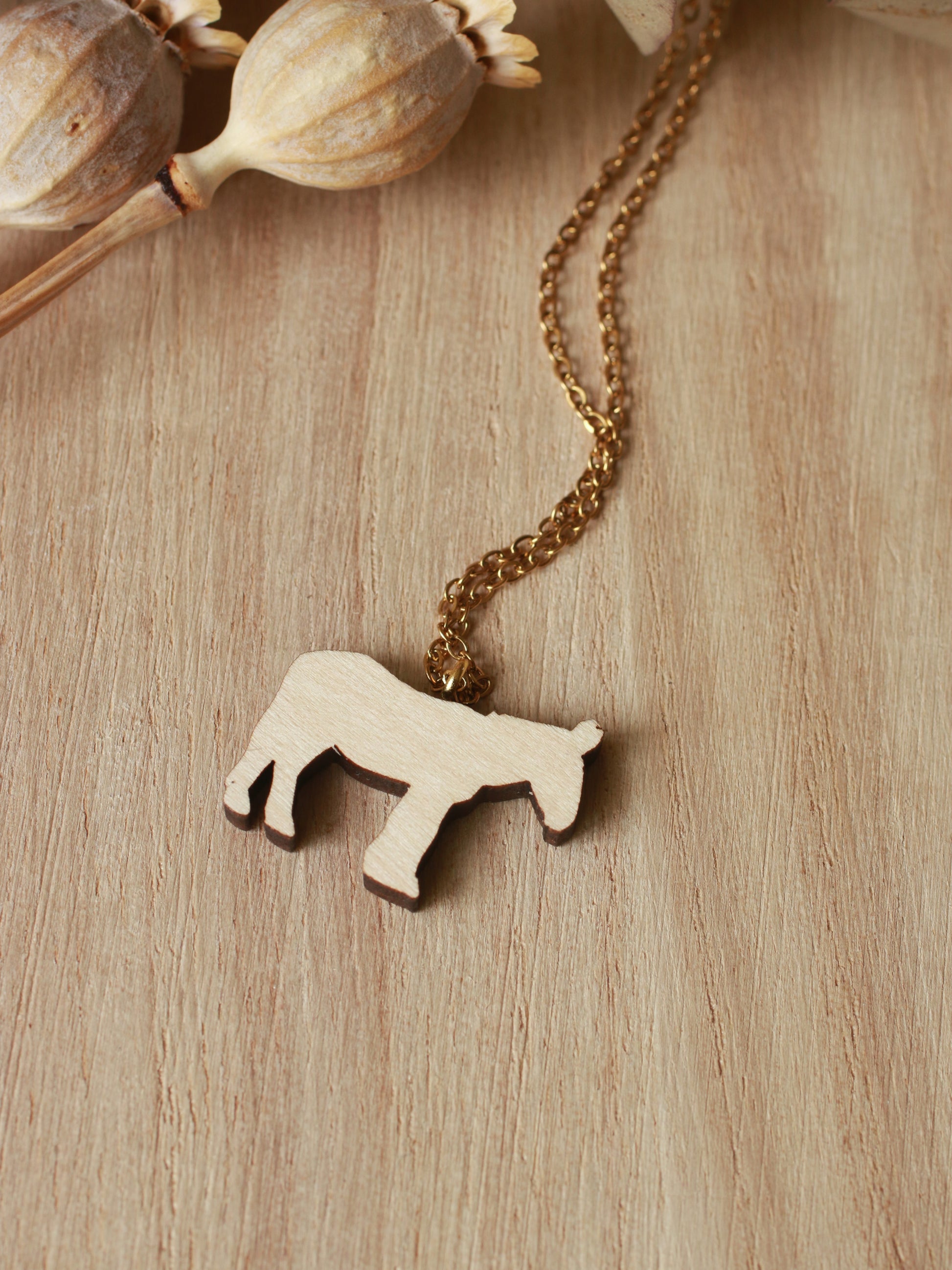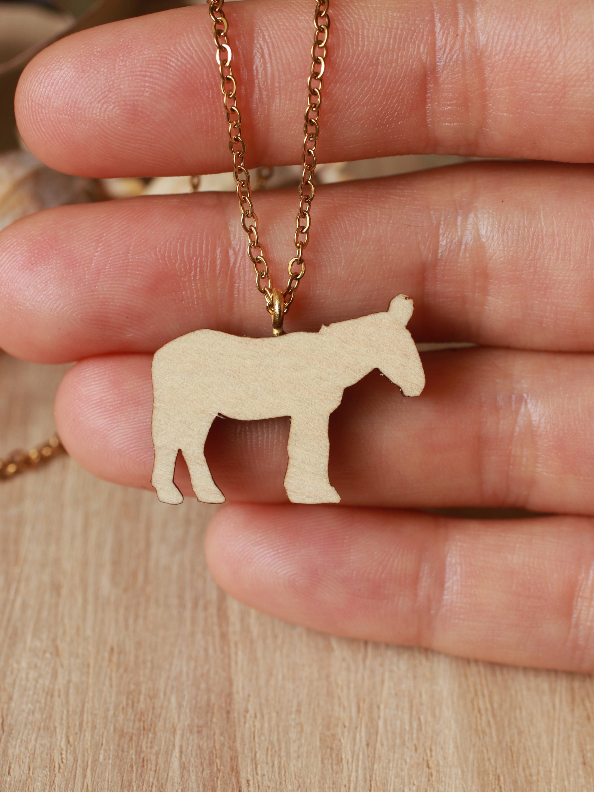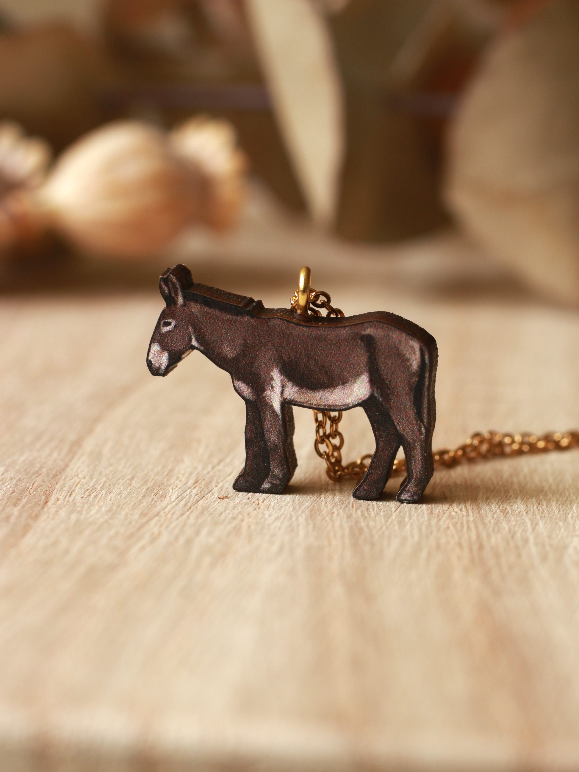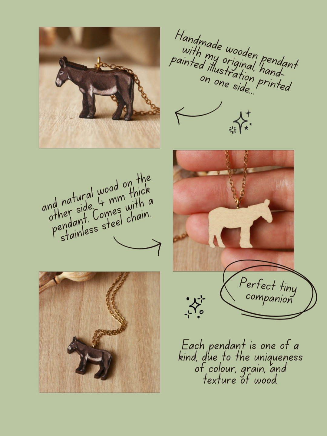 My original donkey painting PRINTED on one of the pendant, and natural wood on the other.
