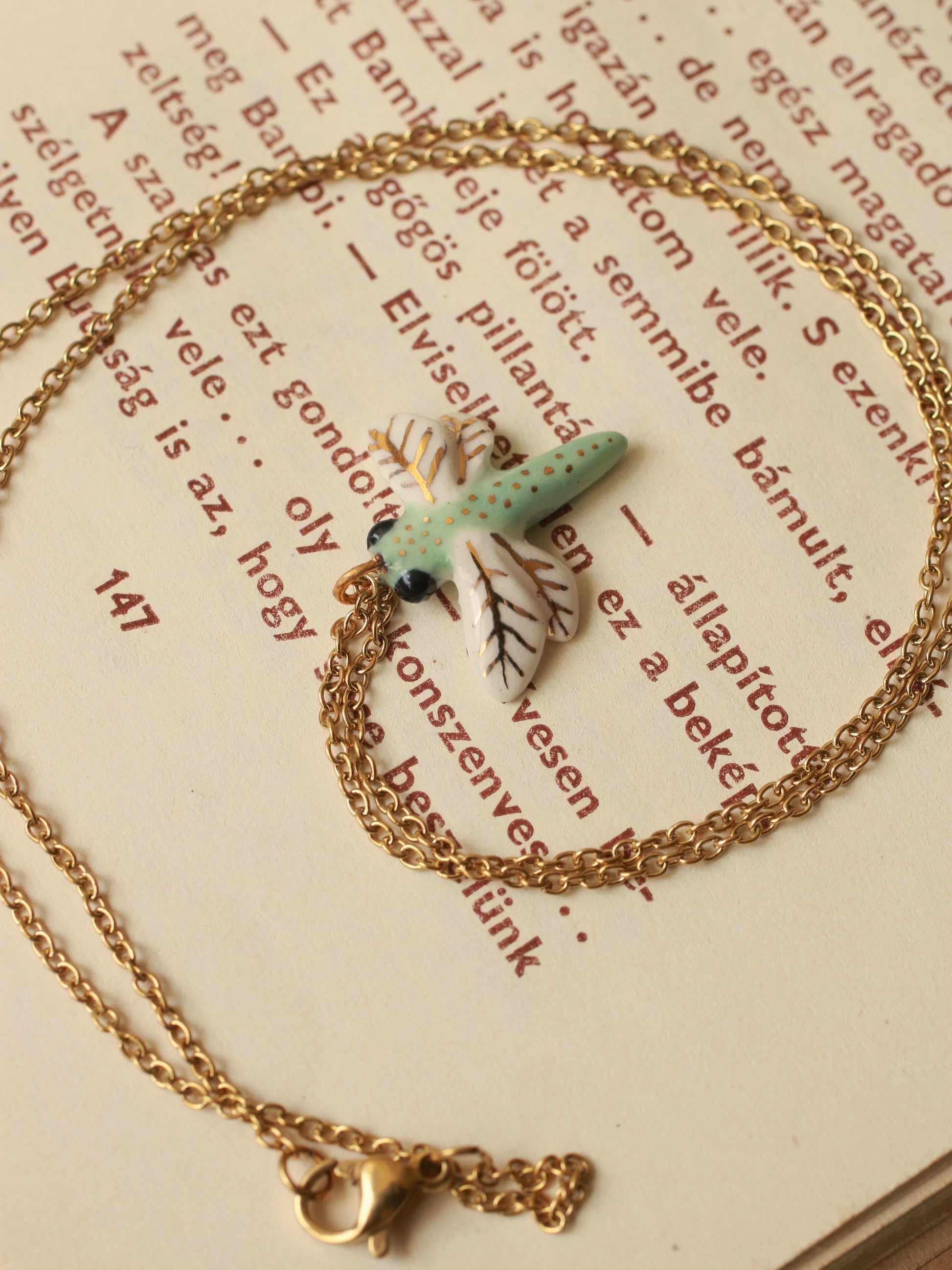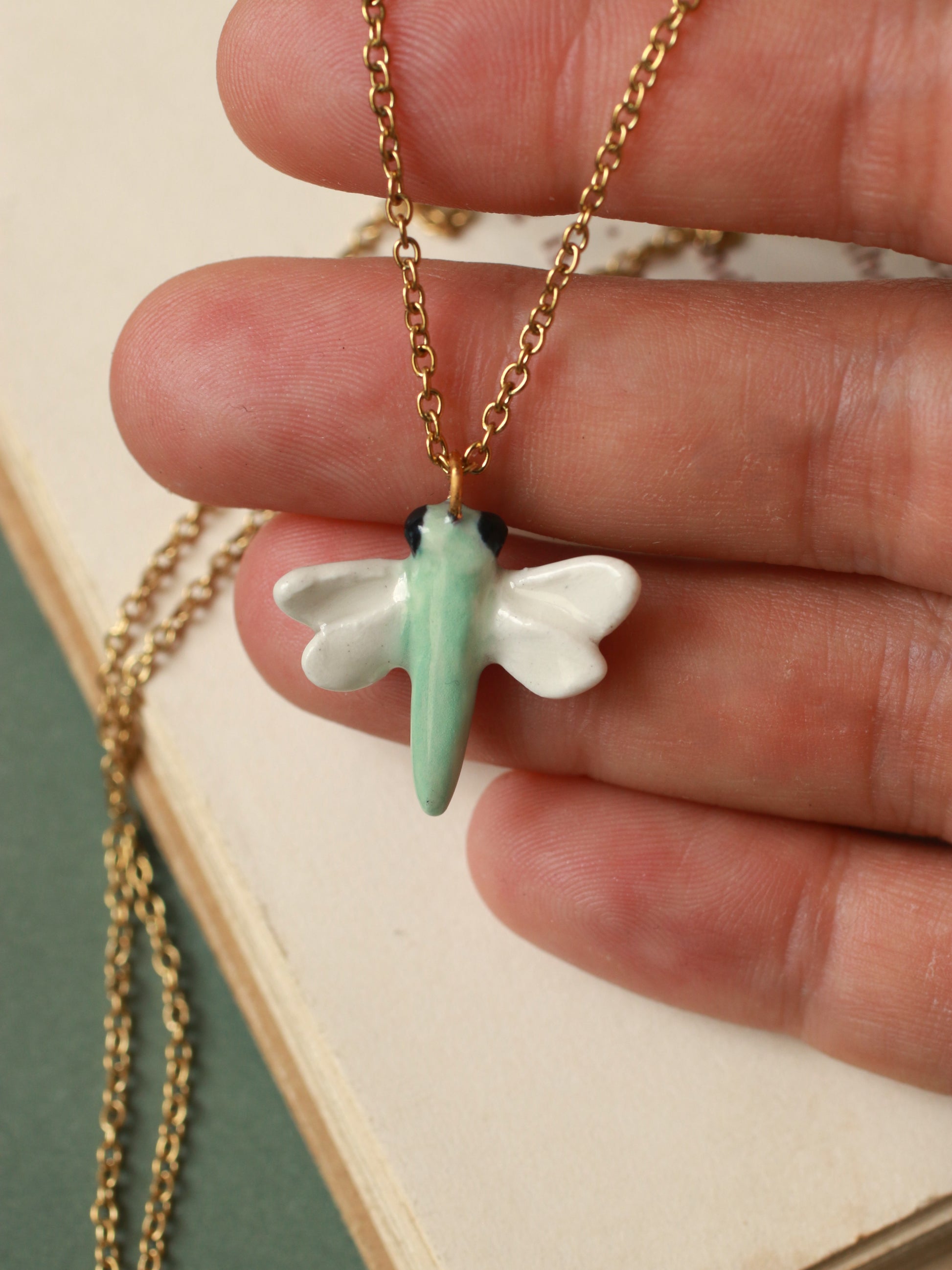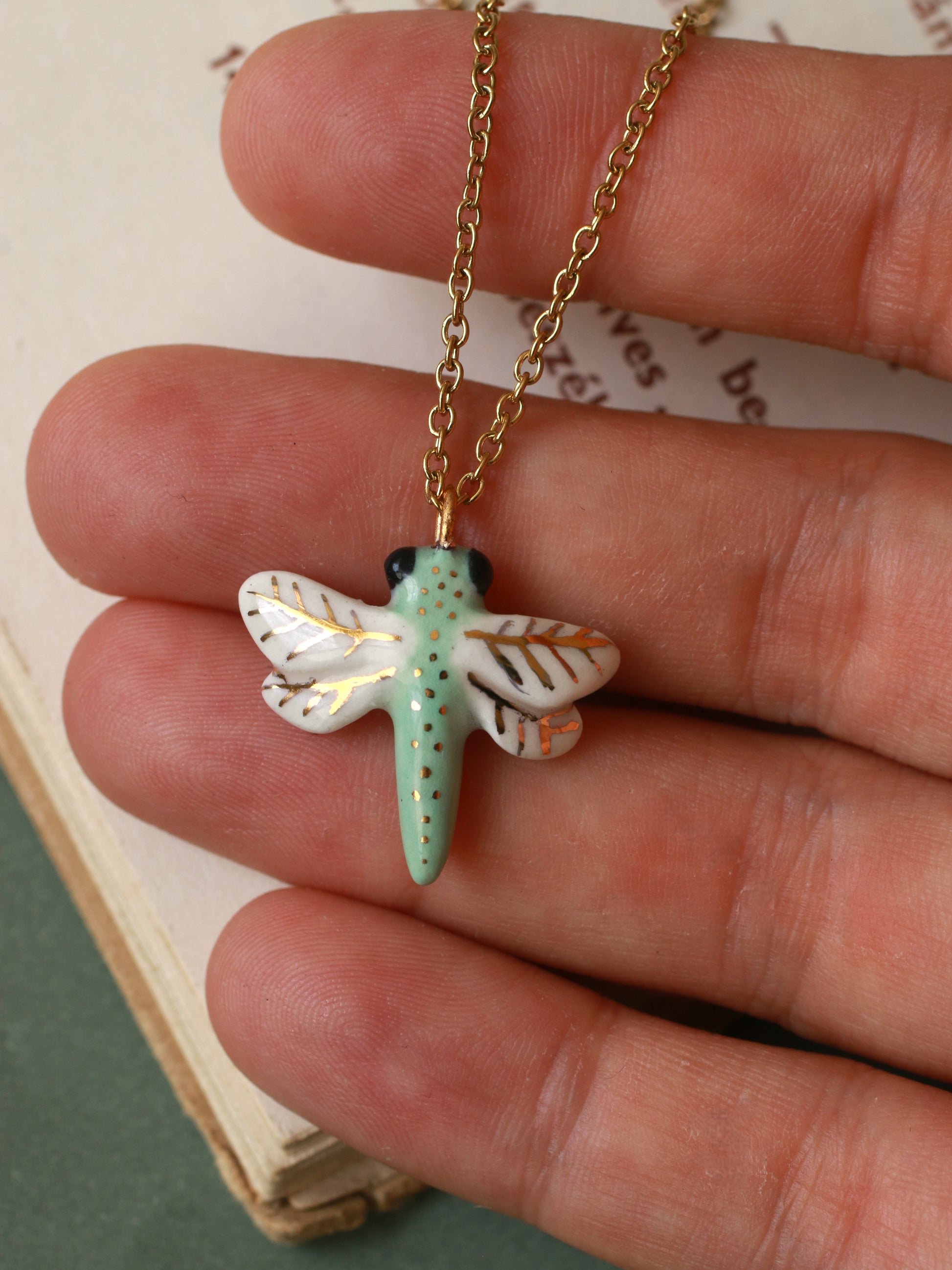 Green dragonfly necklace - gold details