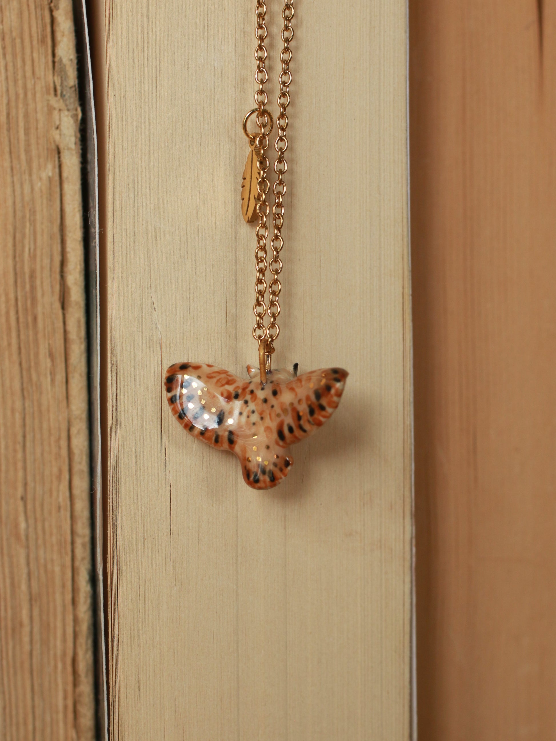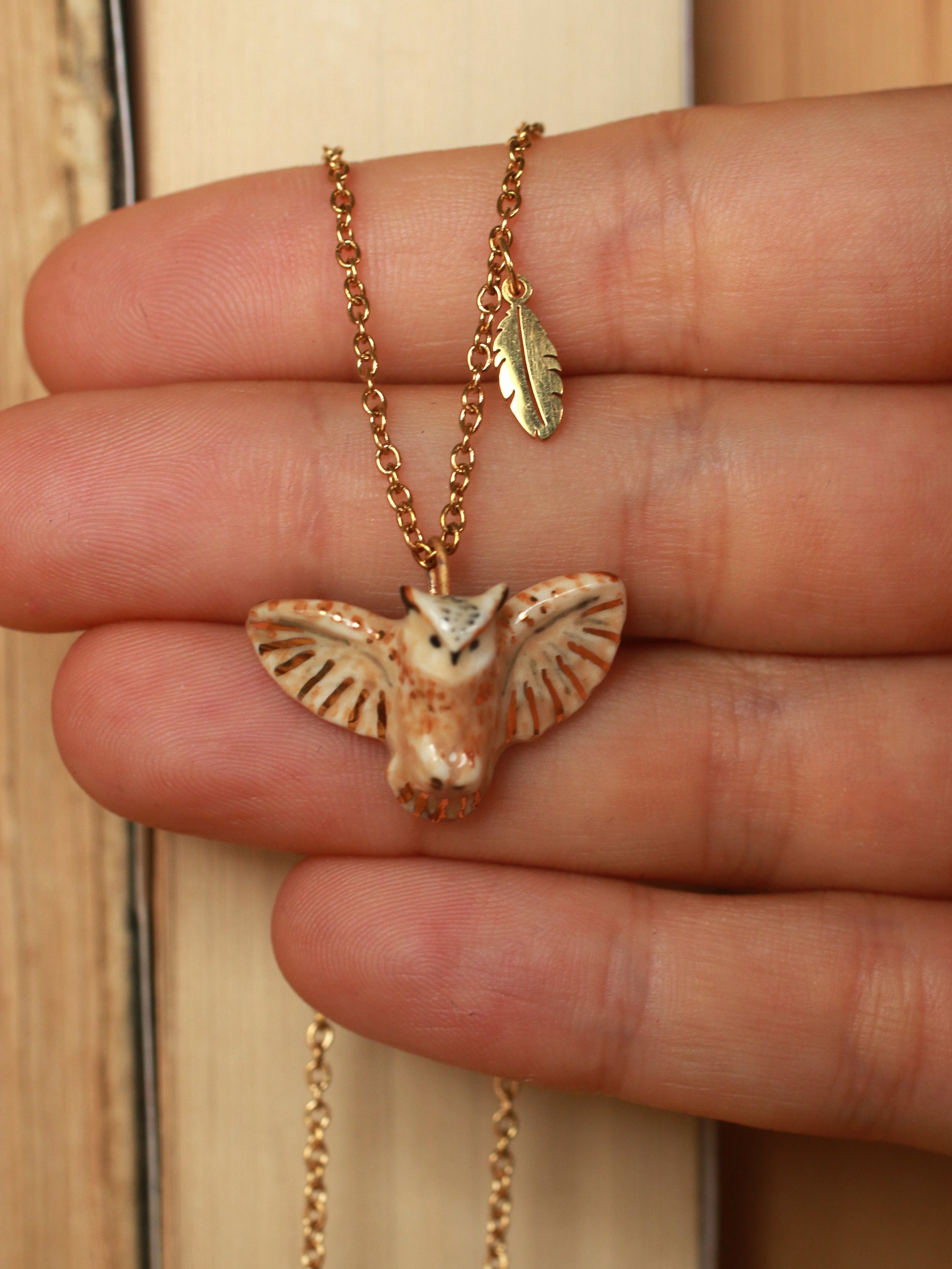 One of a kind ceramic Eagle owl necklace with a tiny feather charm