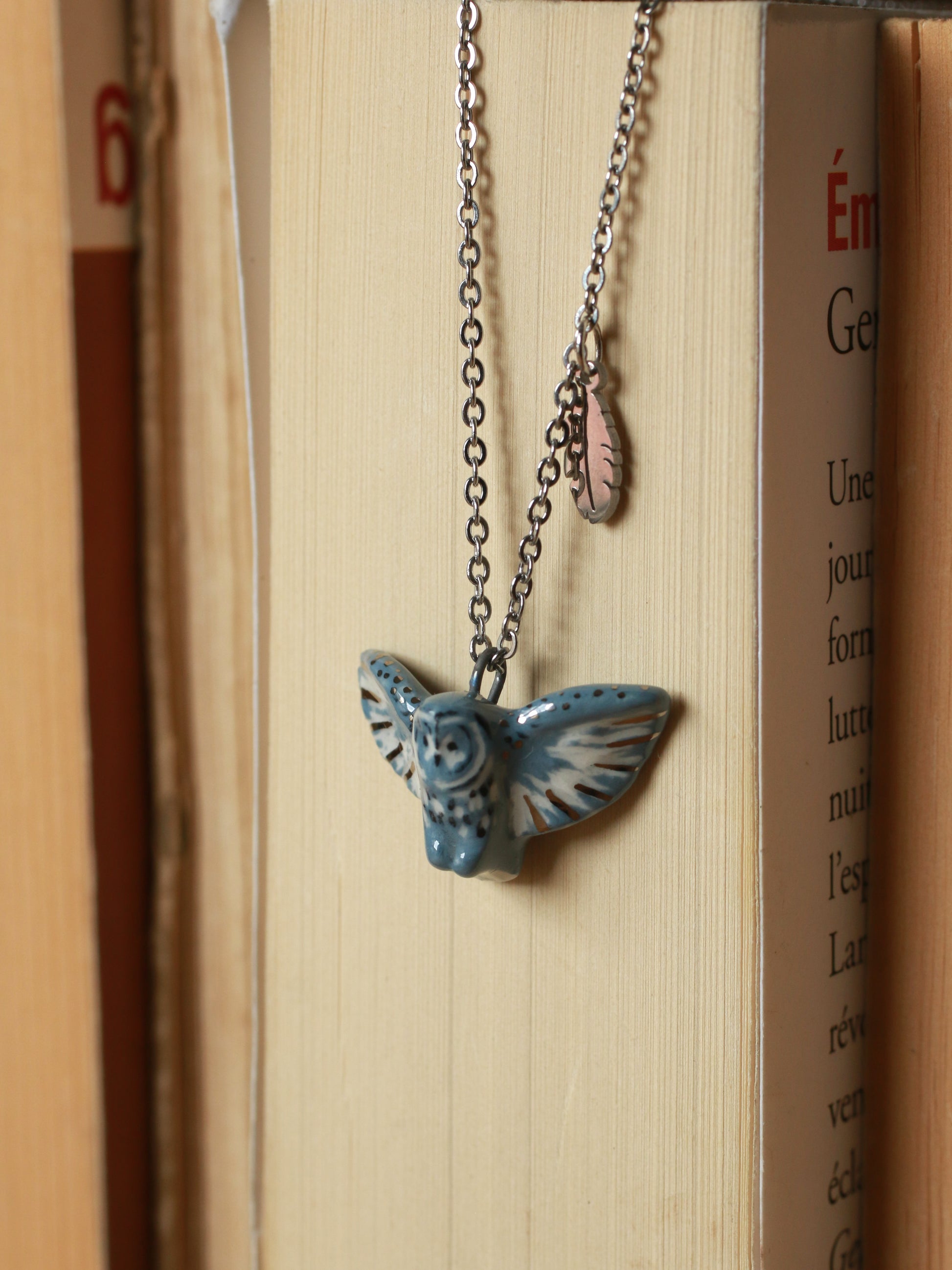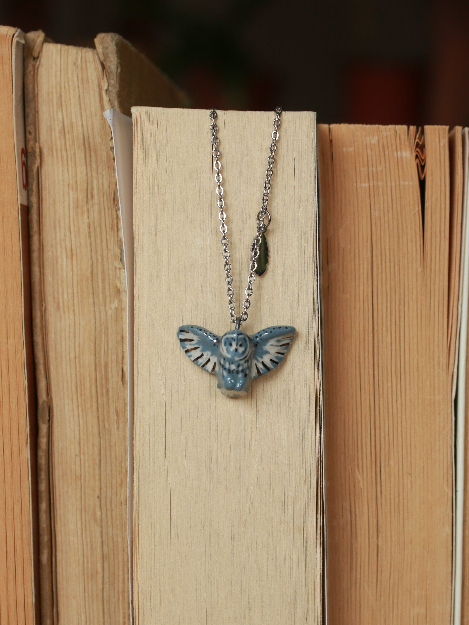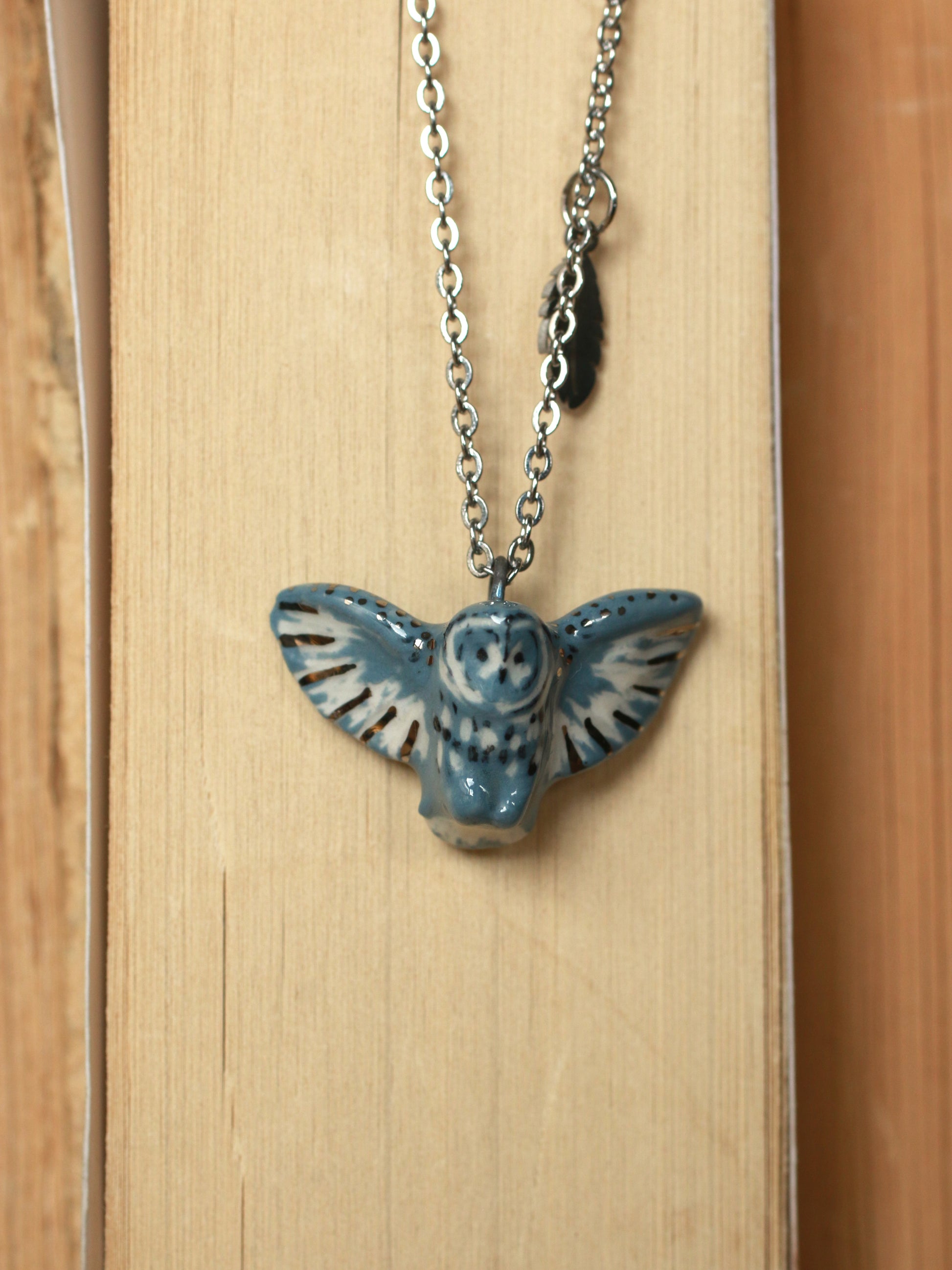 One of a kind ceramic Great grey owl necklace with a tiny feather charm