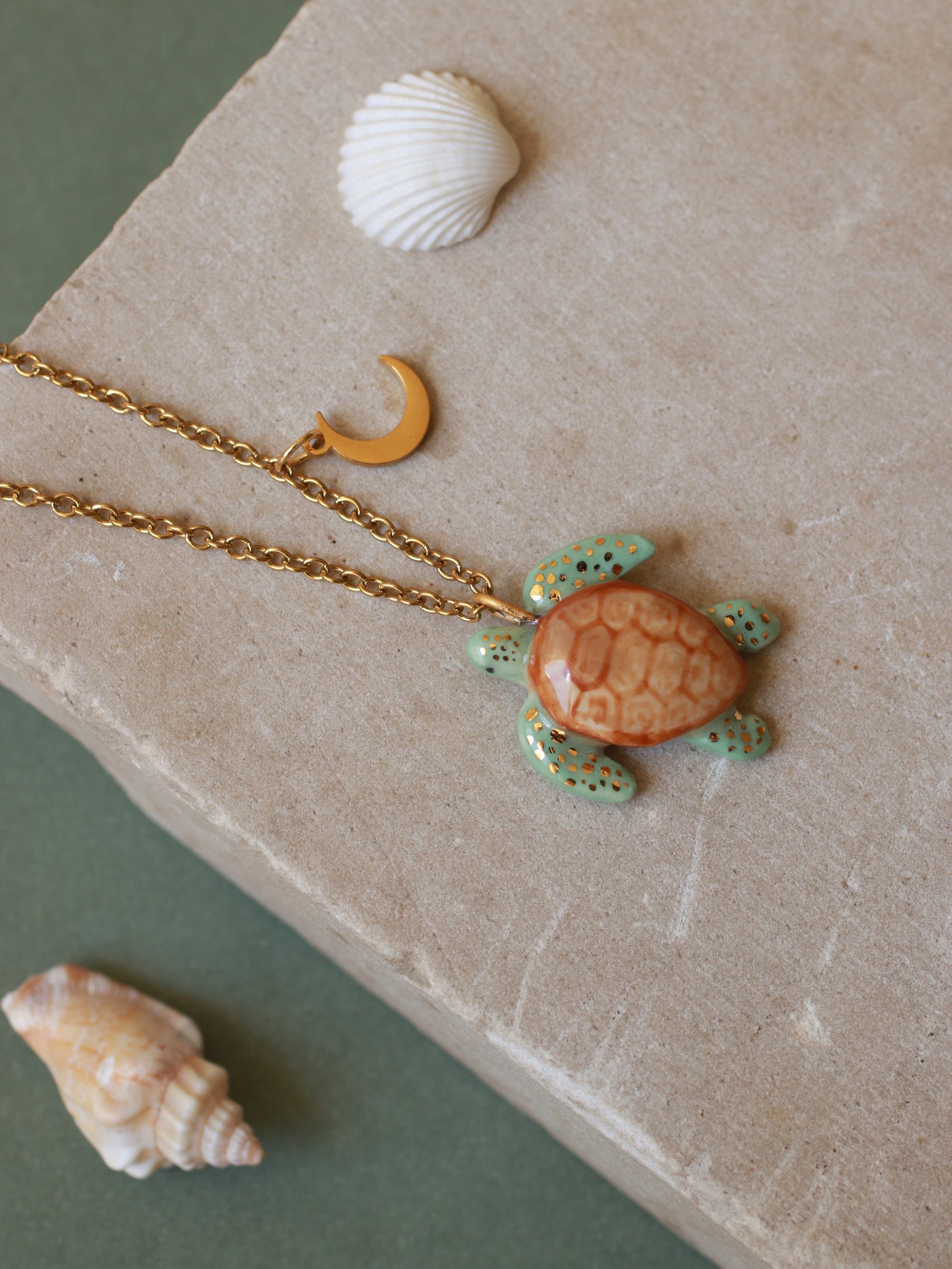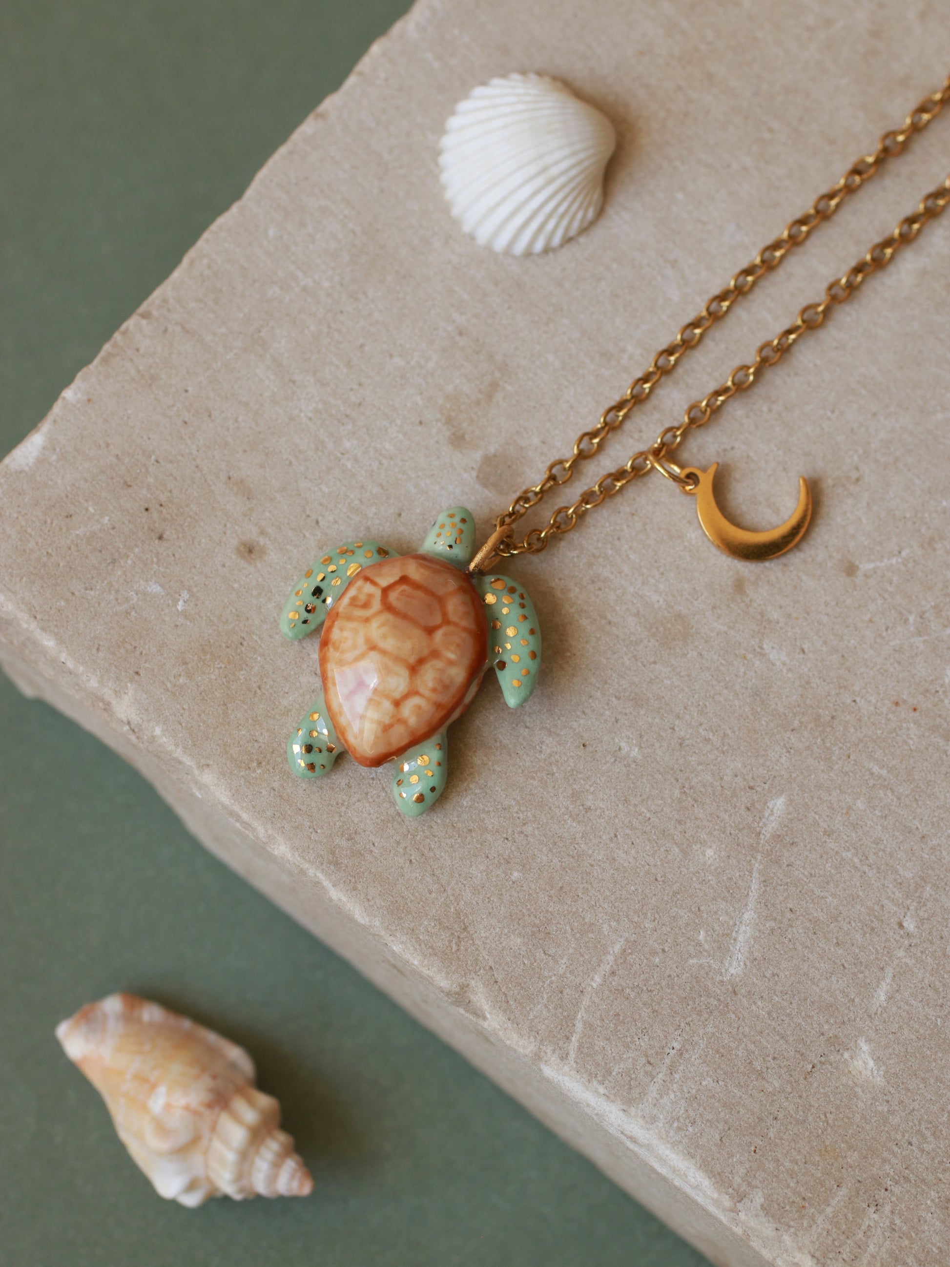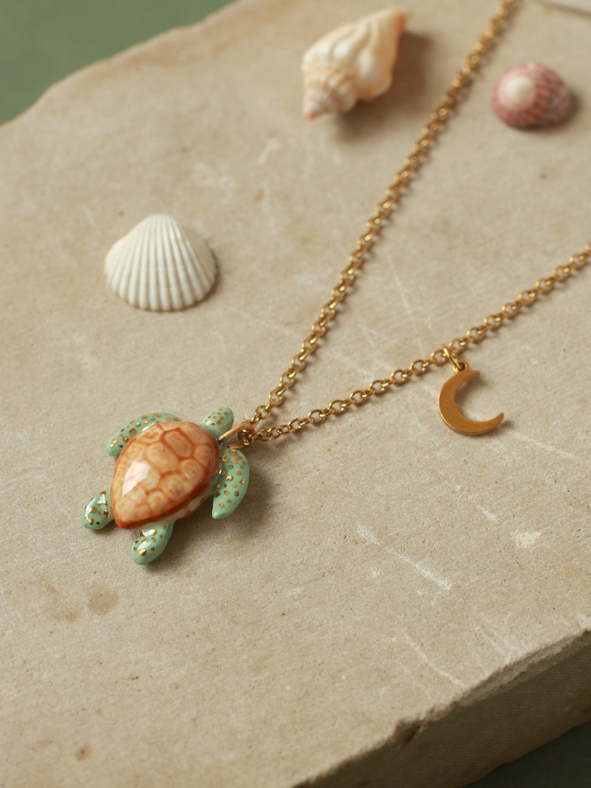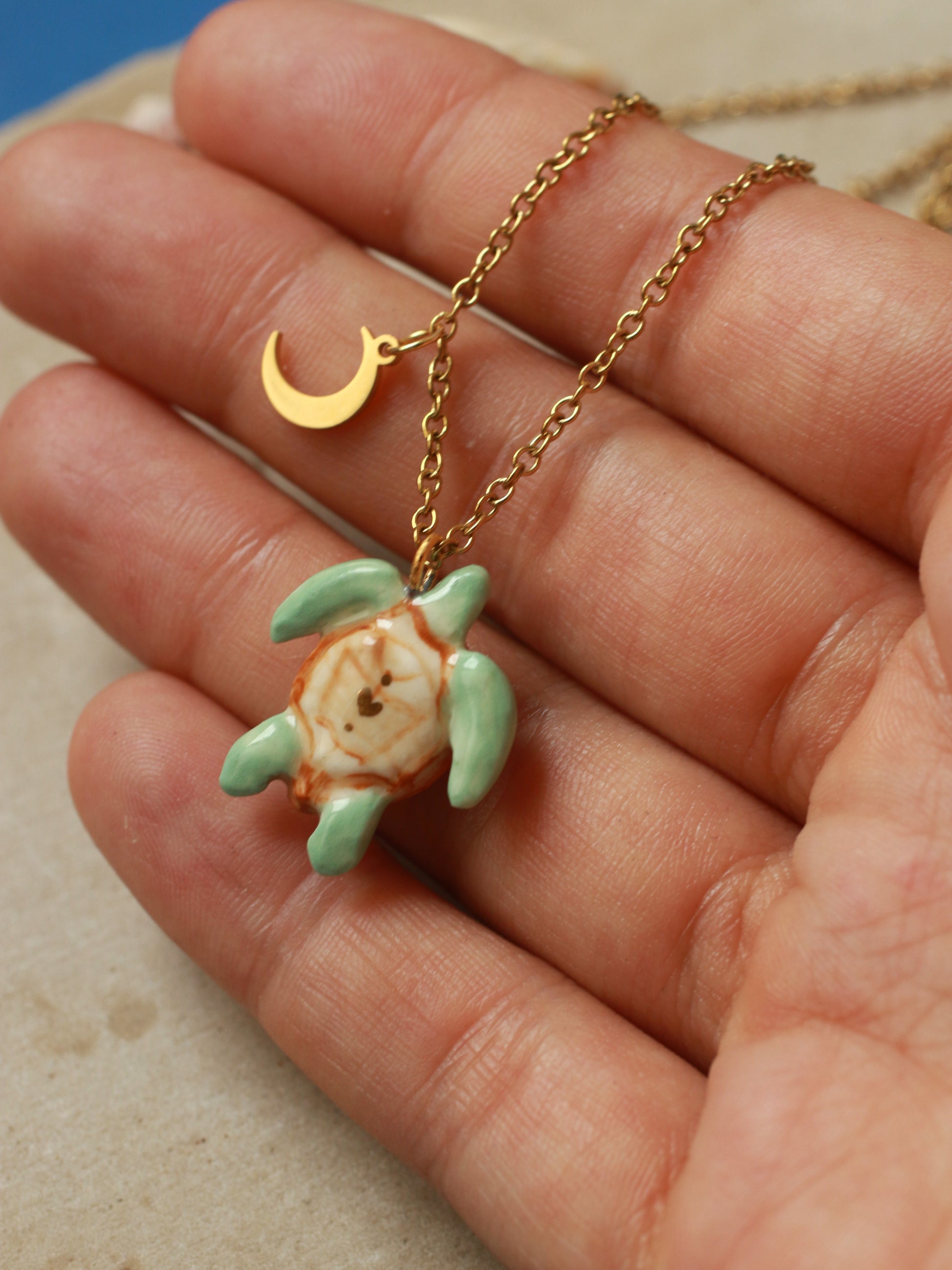 Ceramic Sea turtle necklace - with a tiny moon charm