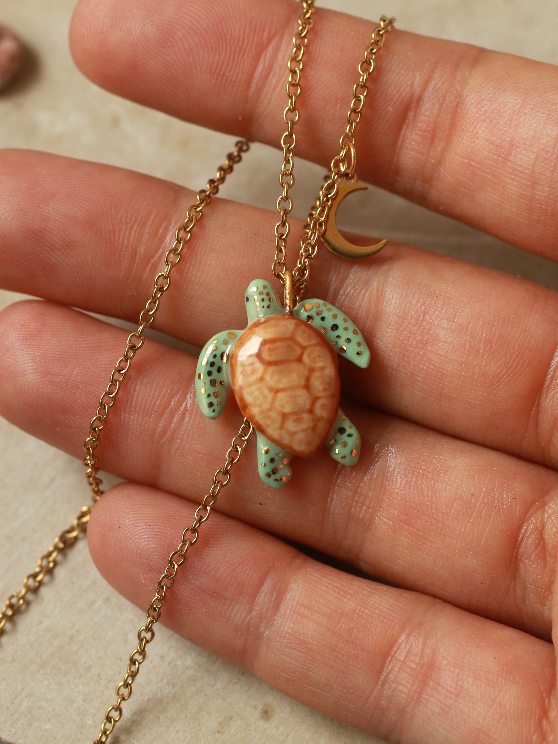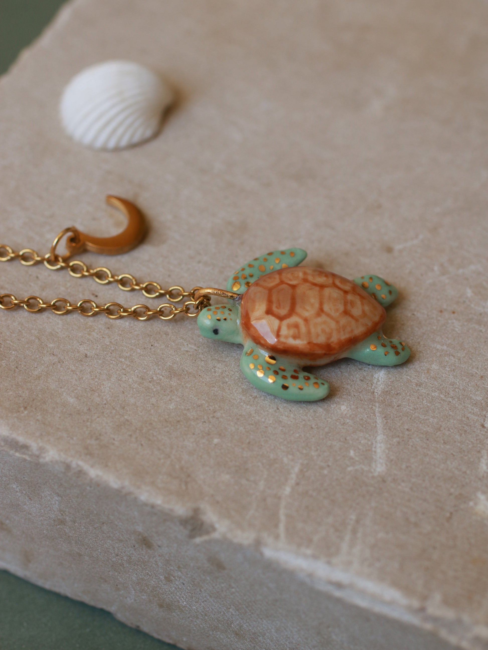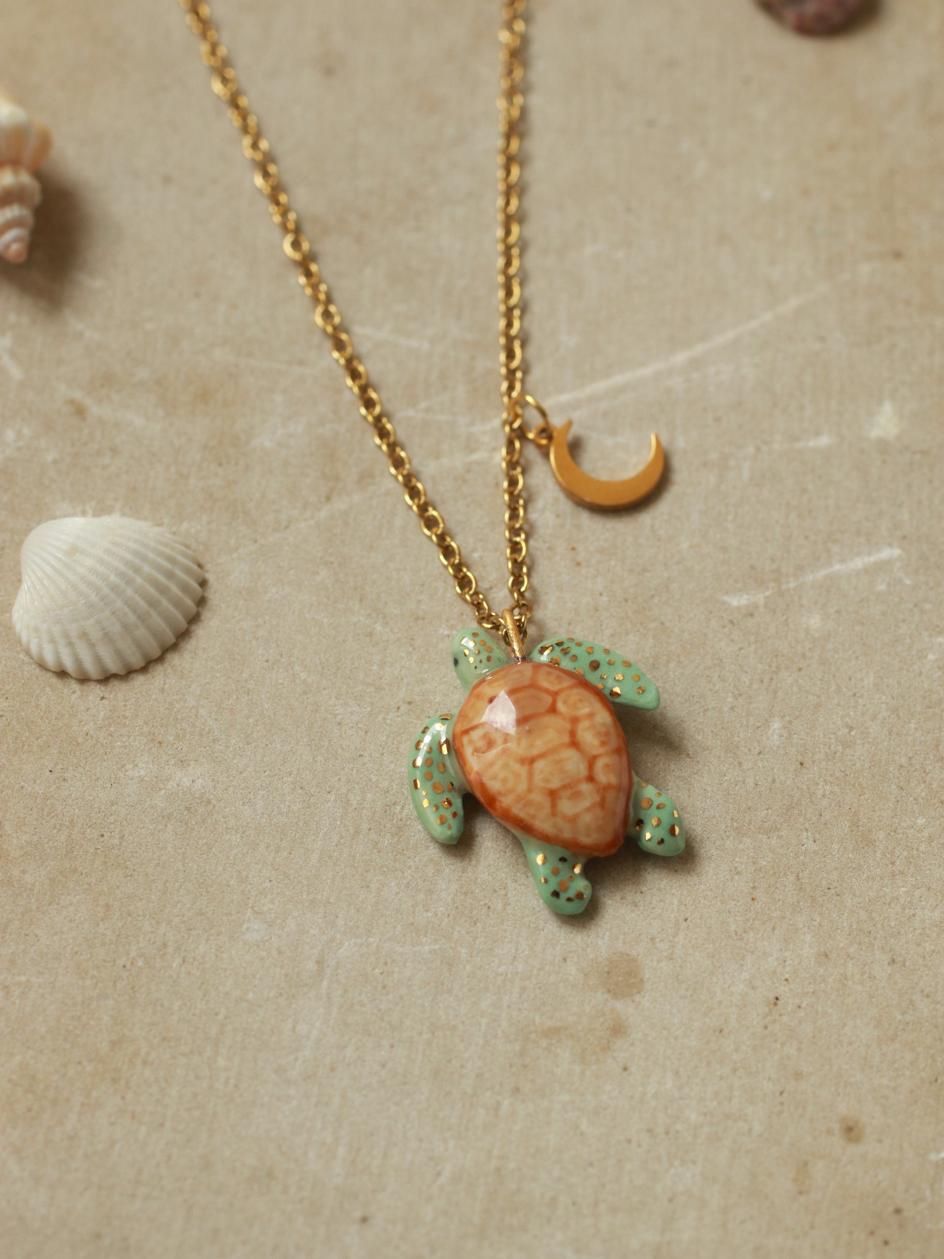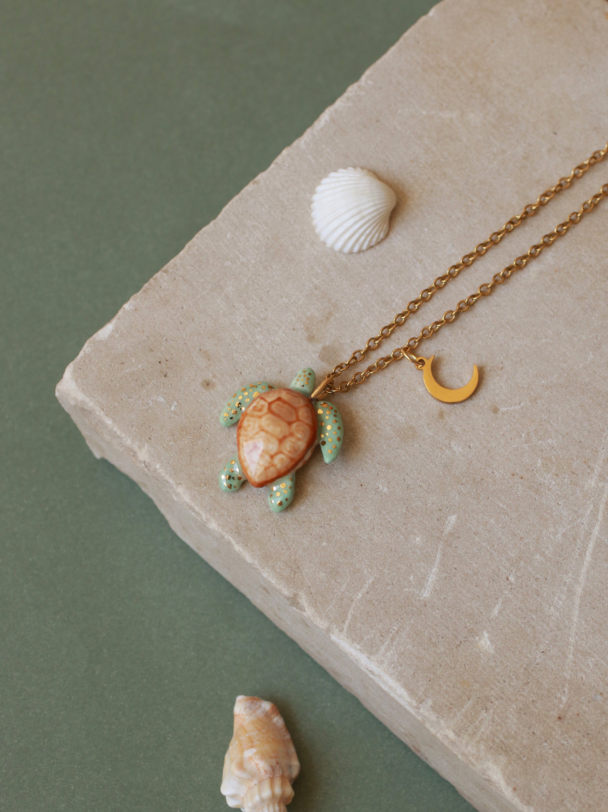 Ceramic Sea turtle necklace - with a tiny moon charm
