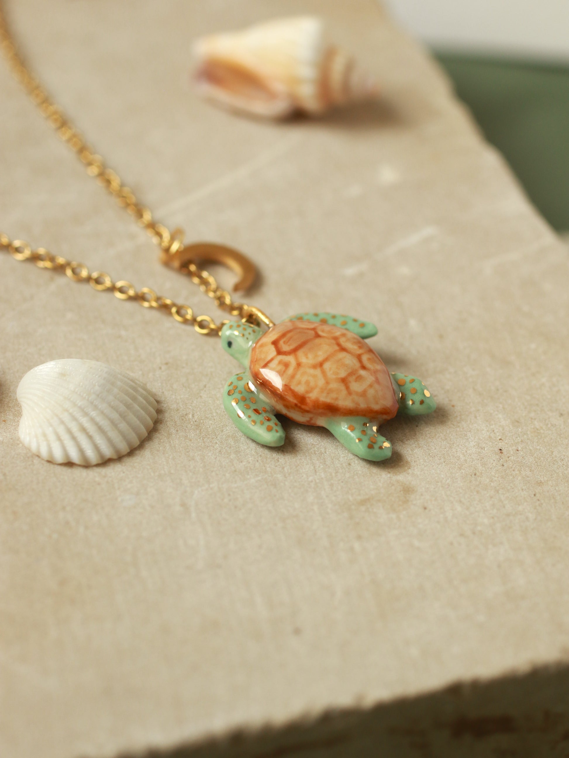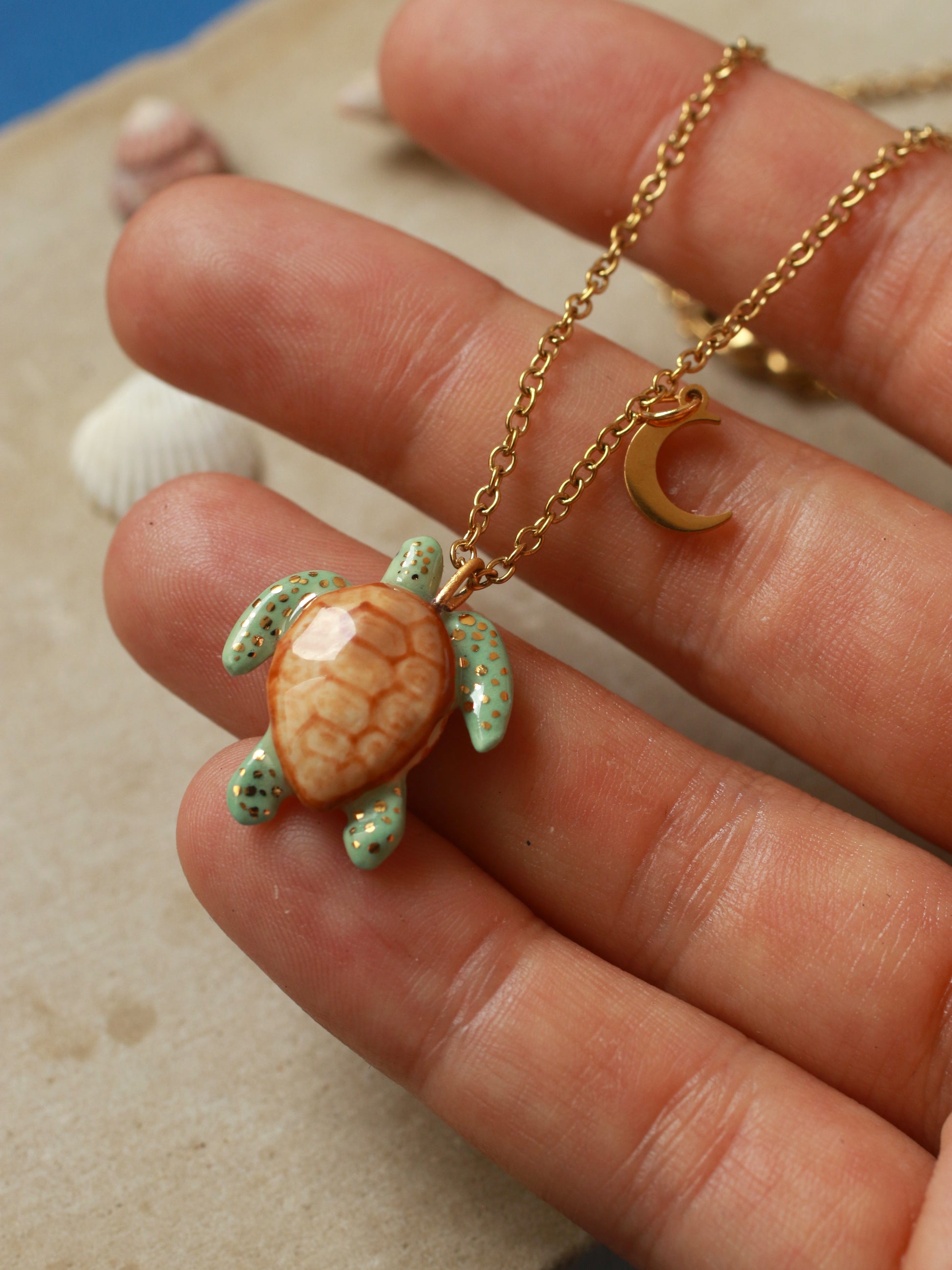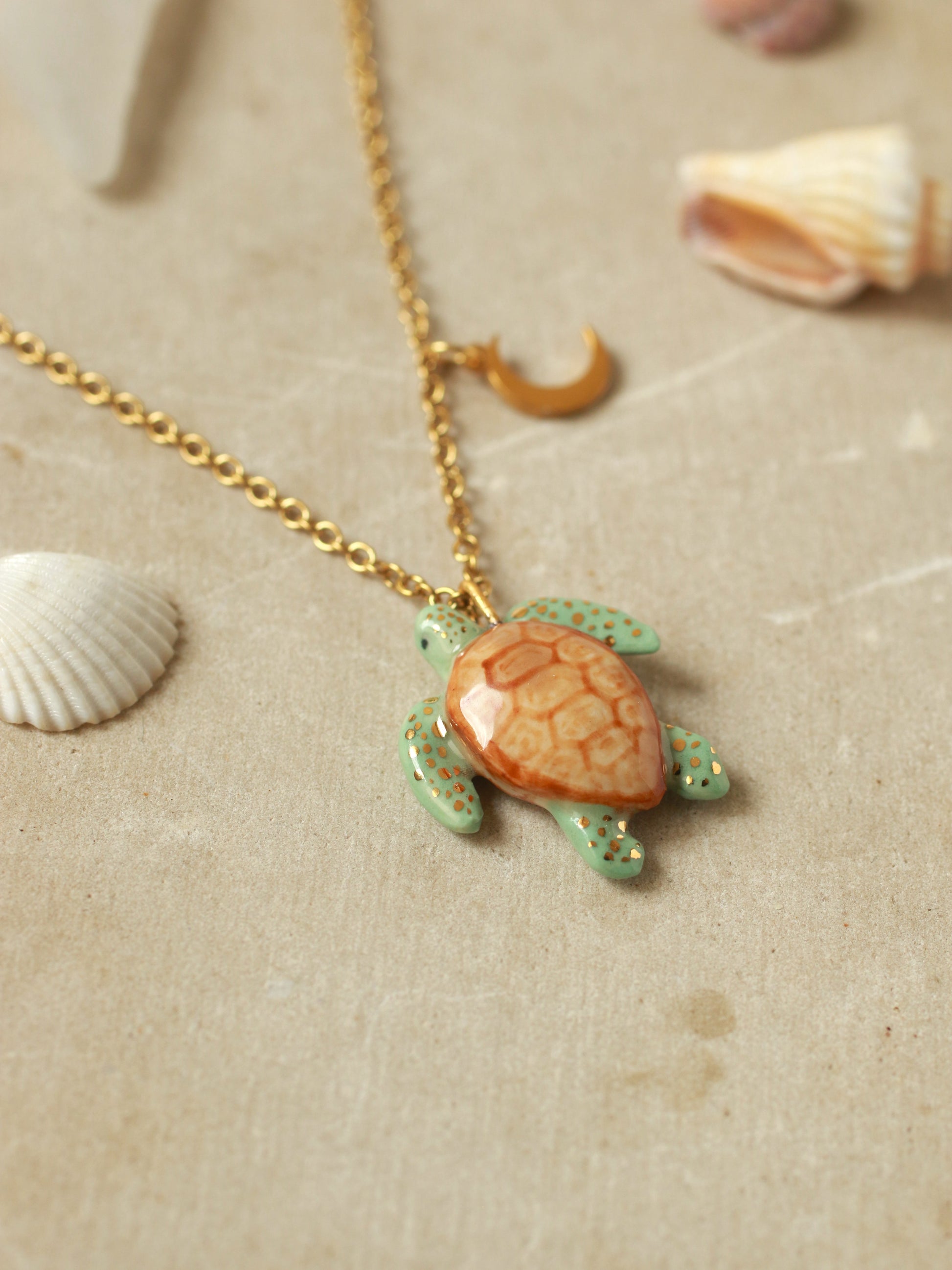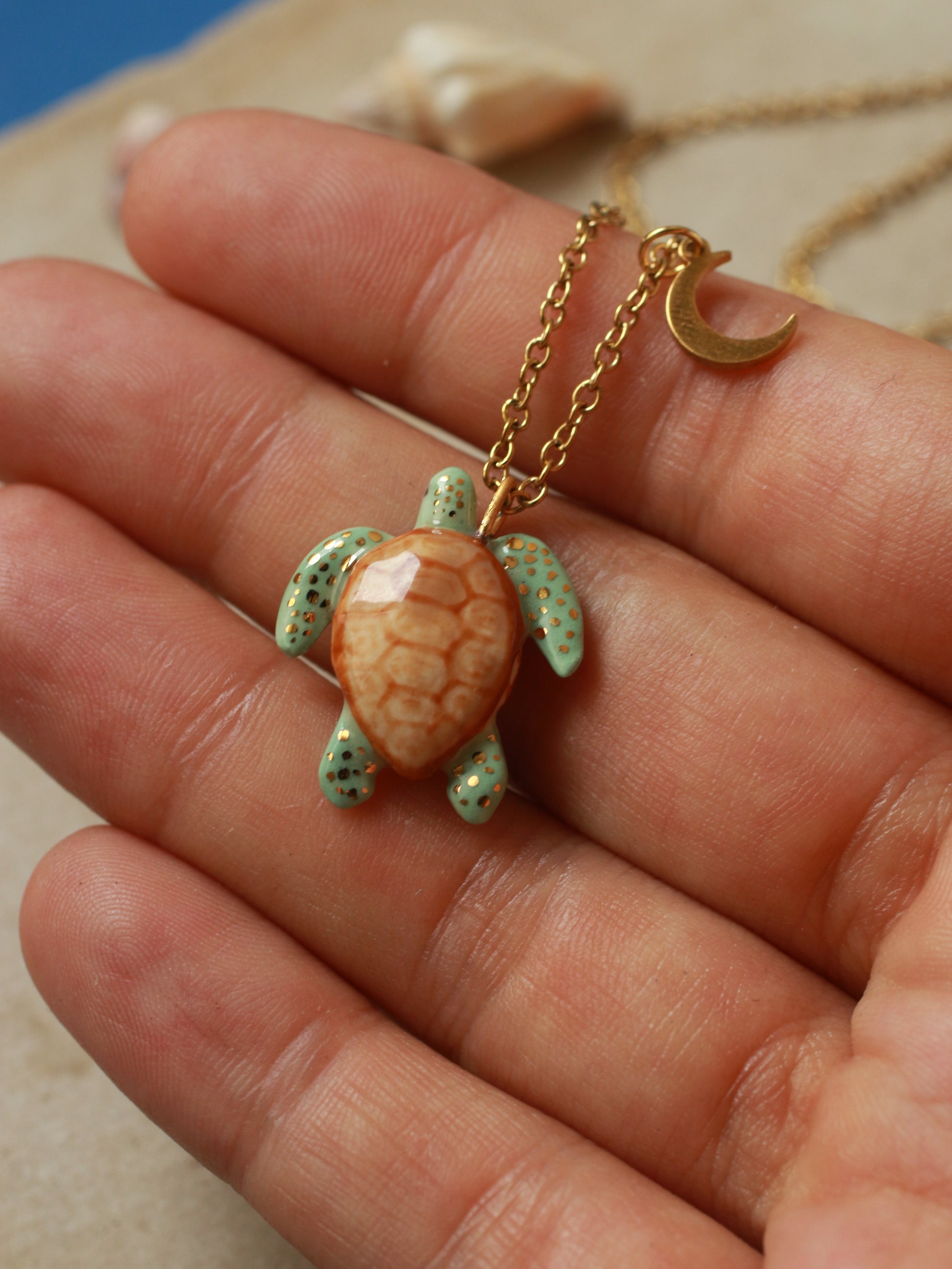 Ceramic Sea turtle necklace - with a tiny moon charm