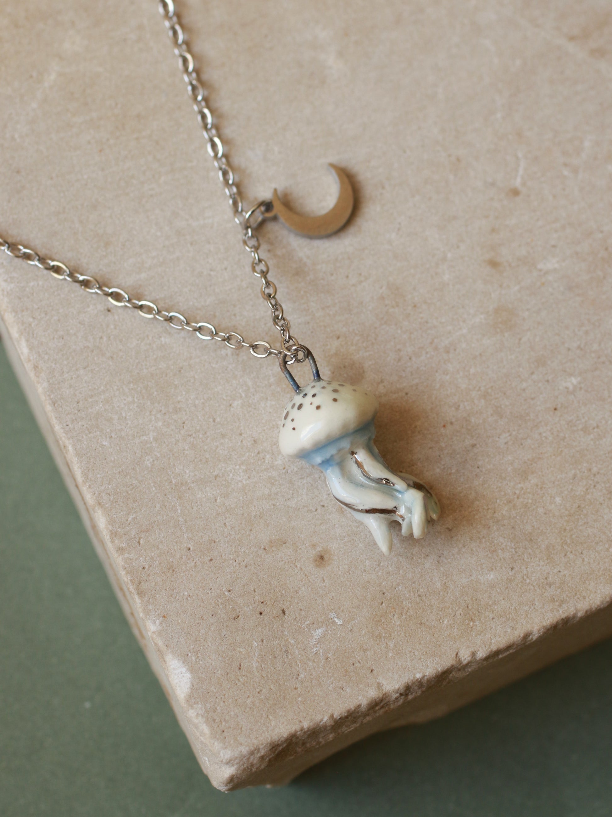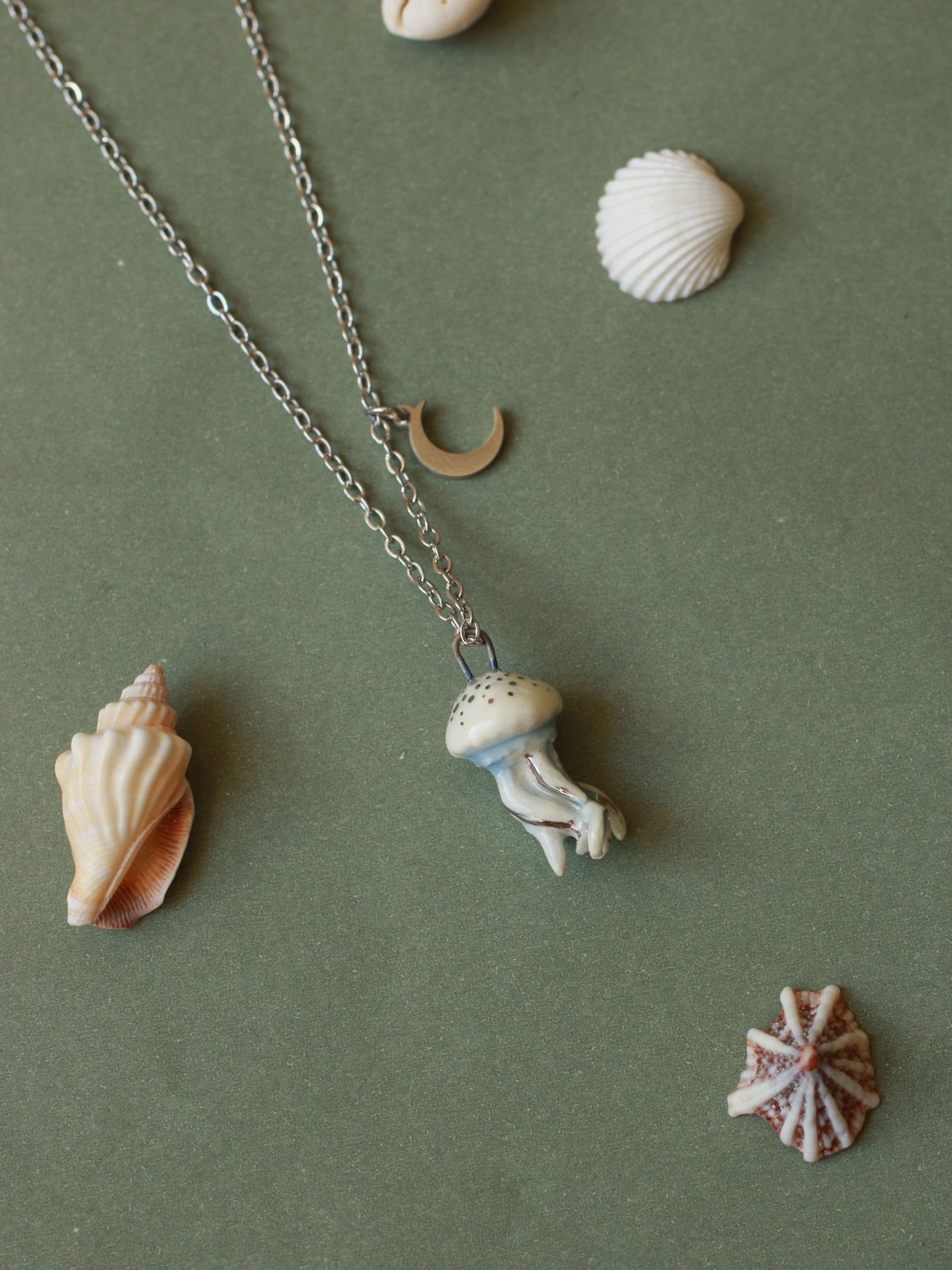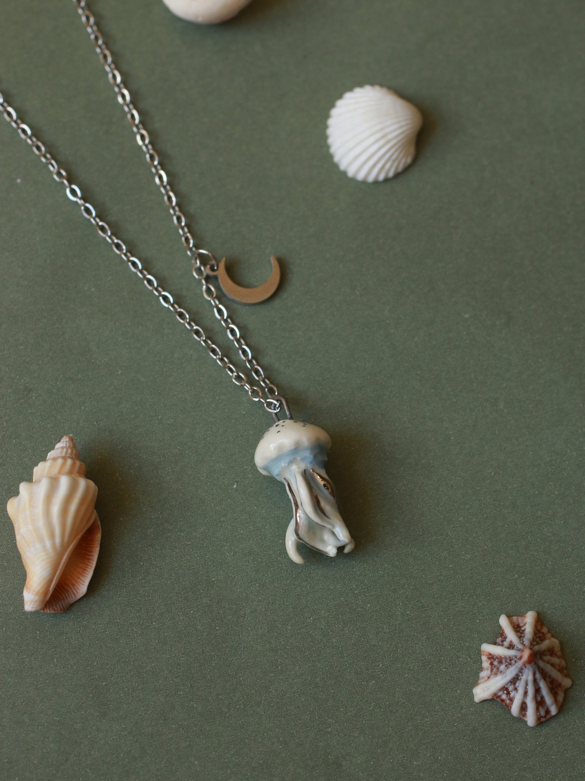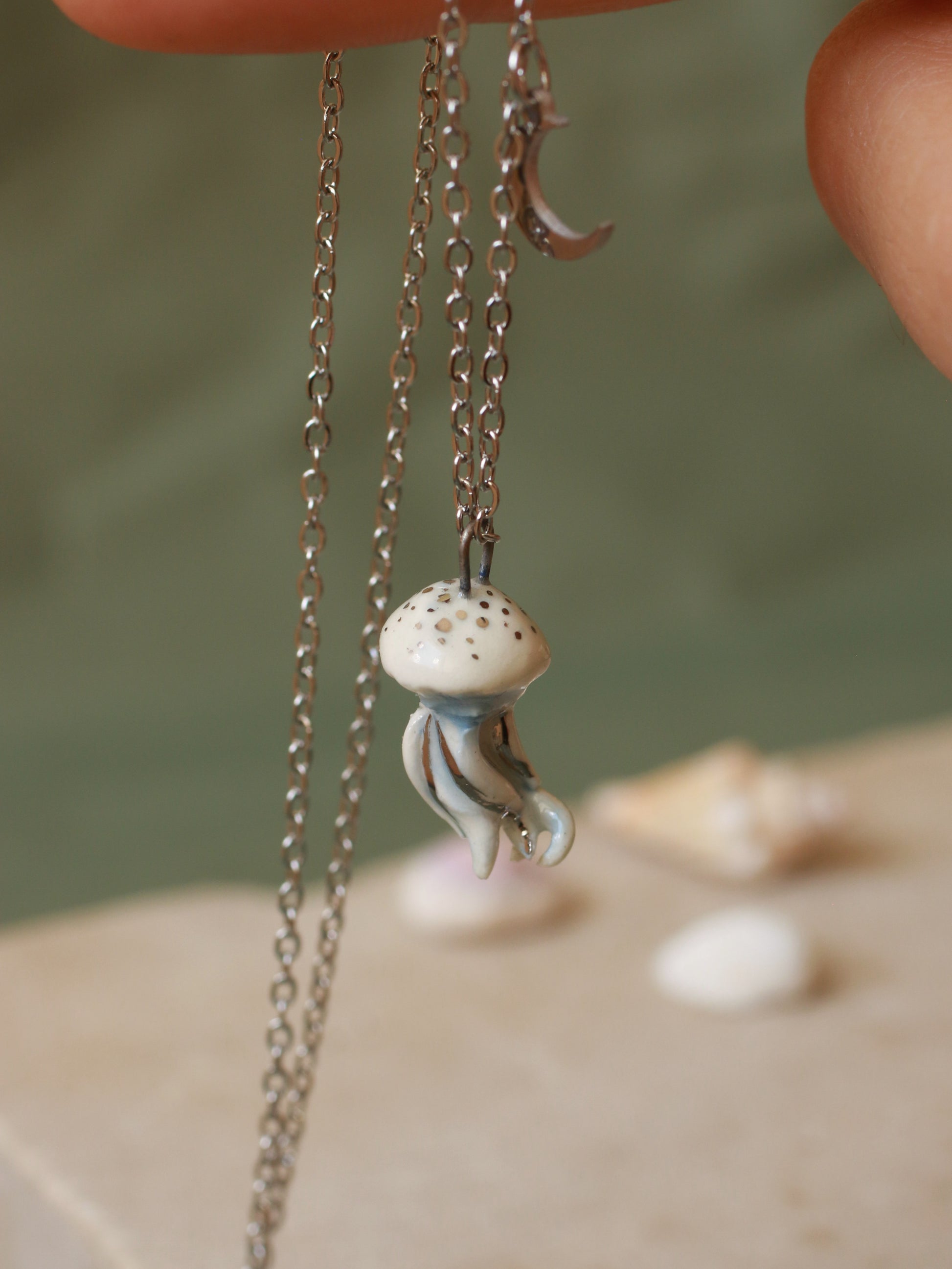 Ceramic Jellyfish necklace - with a tiny moon charm