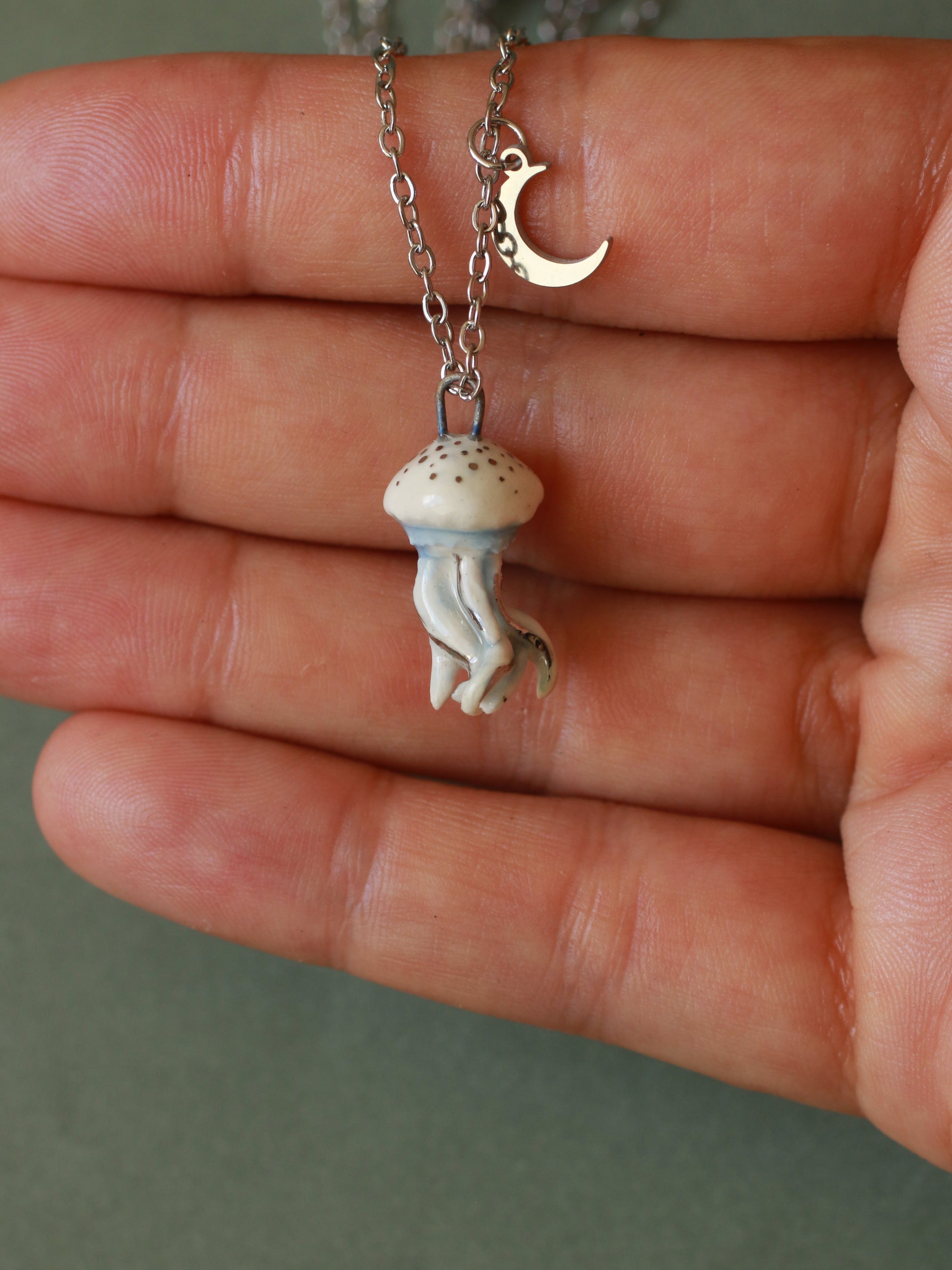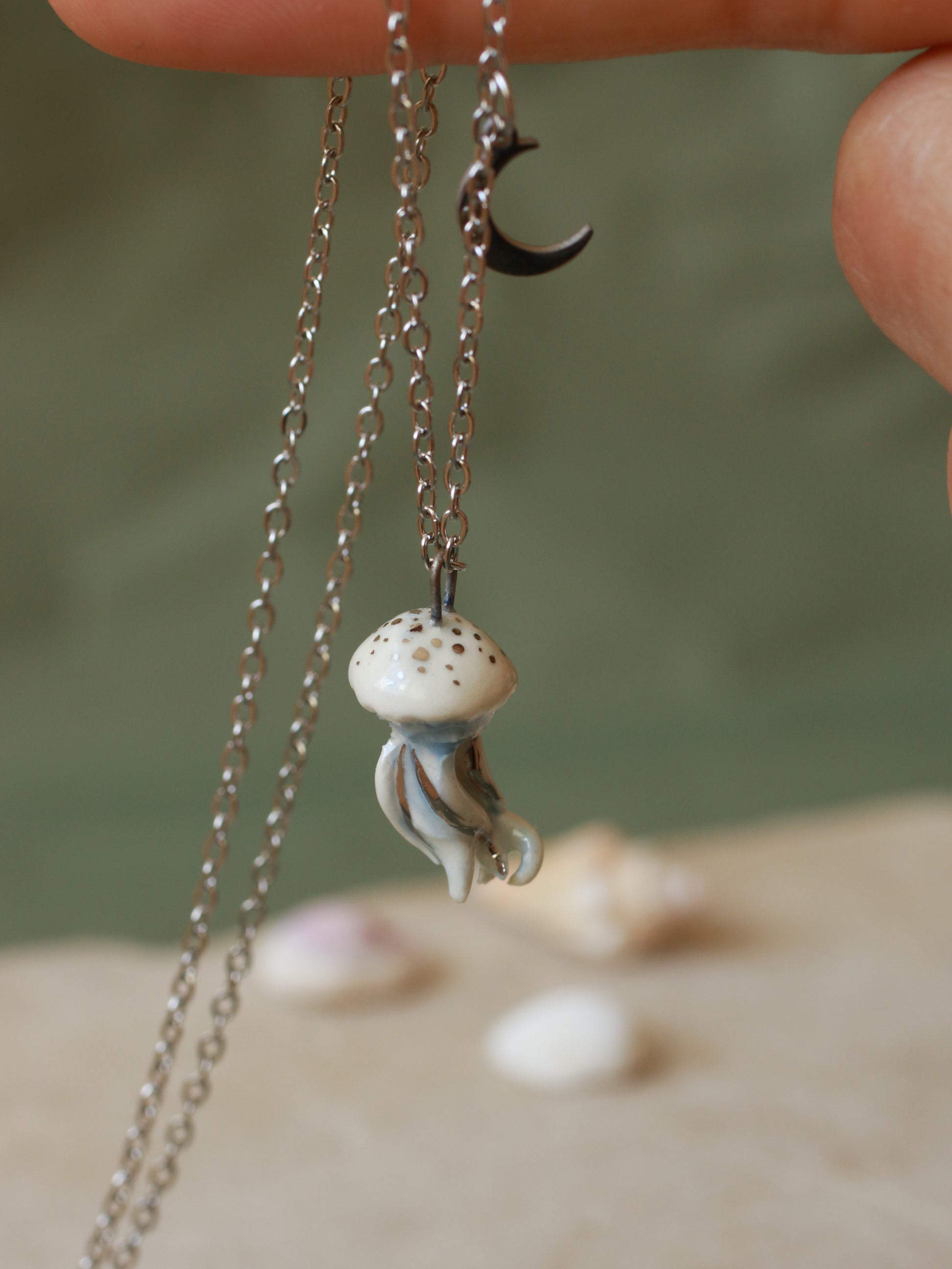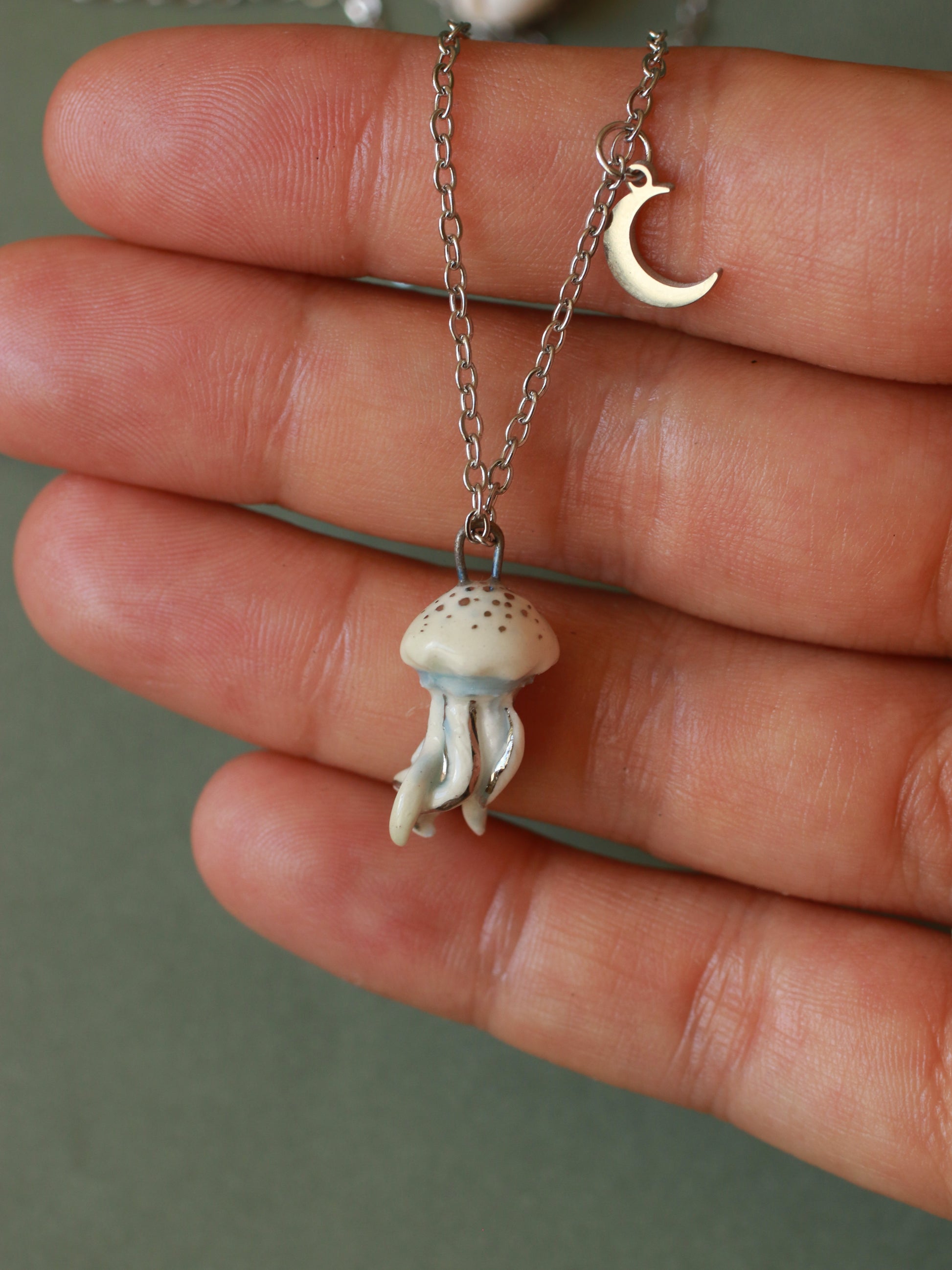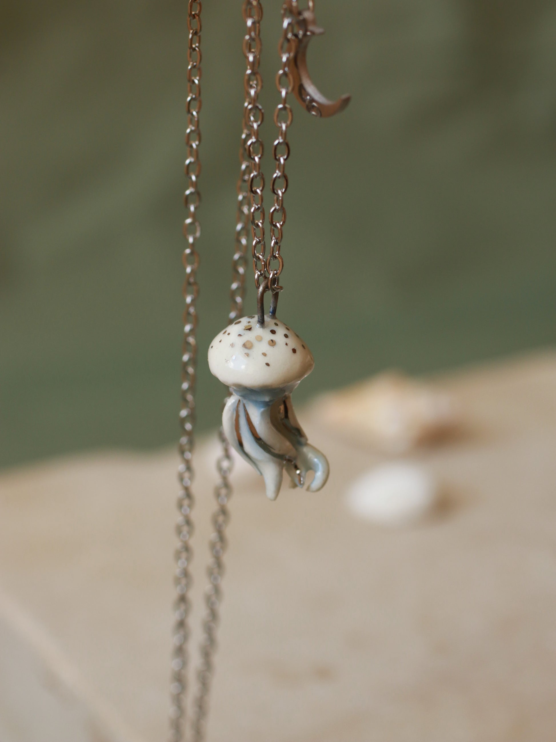 Ceramic Jellyfish necklace - with a tiny moon charm