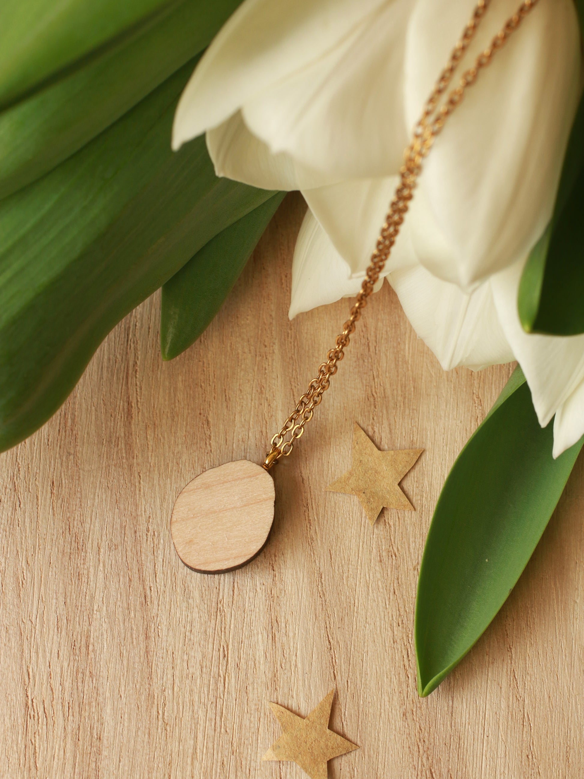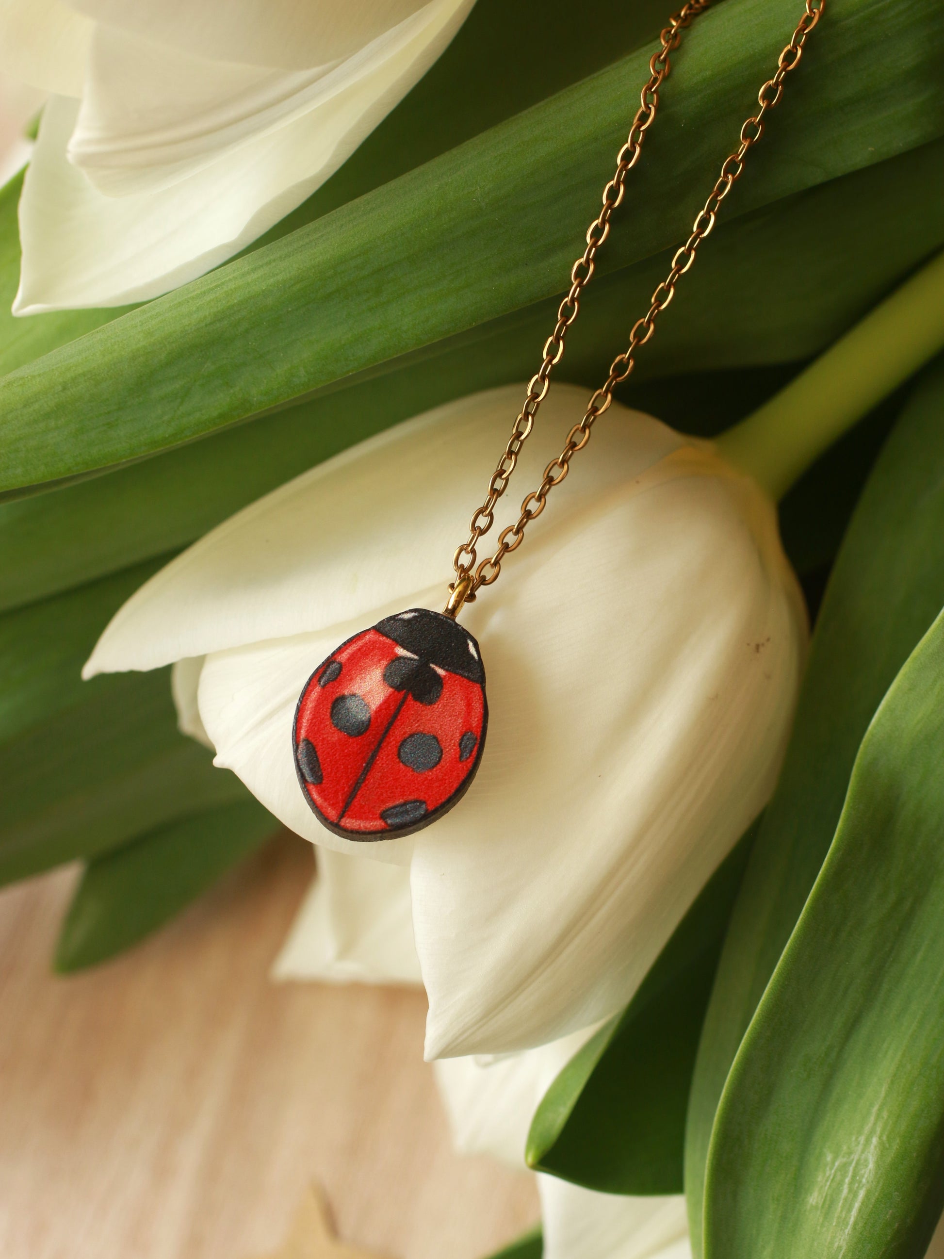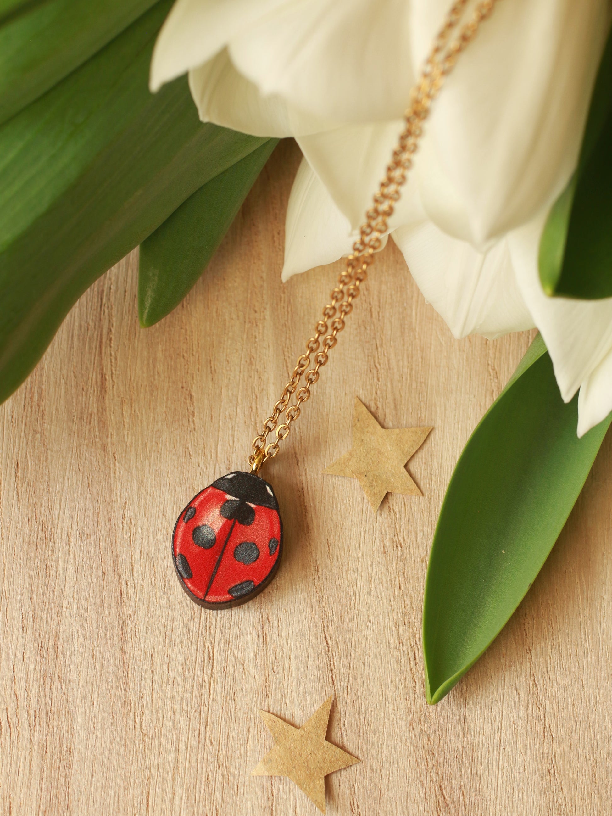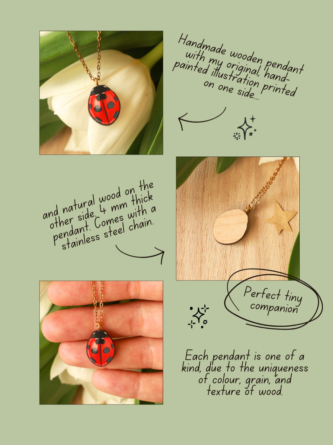 ▸With my original ladybug illustration printed on one side of the pendant and natural wood on the other.
