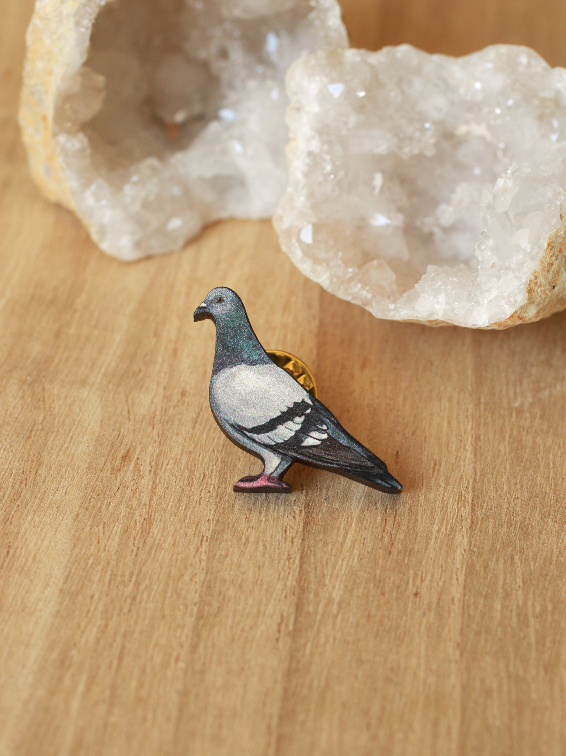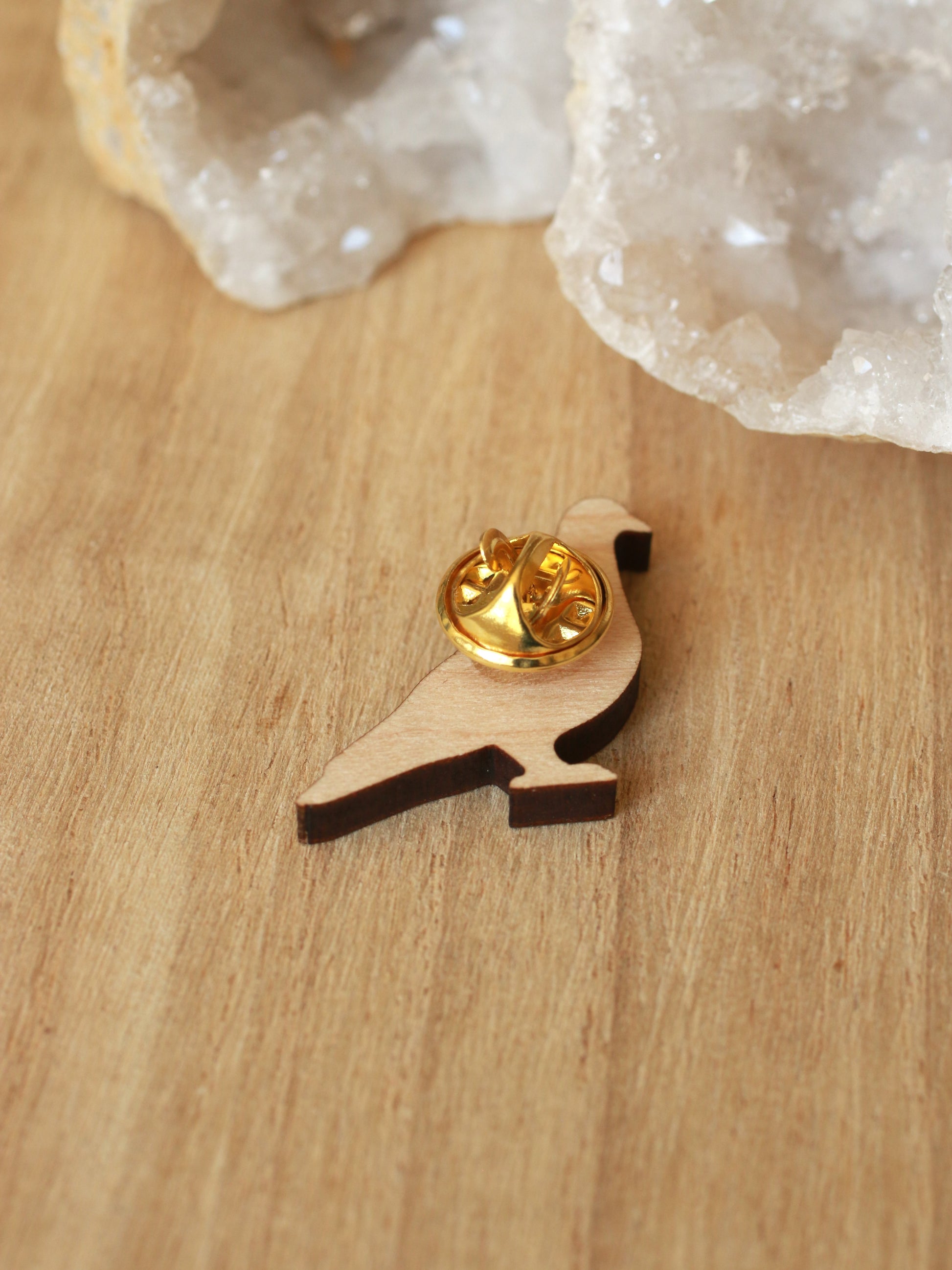 My original pigeon design printed on one side of the pin, and natural wood on the other side.