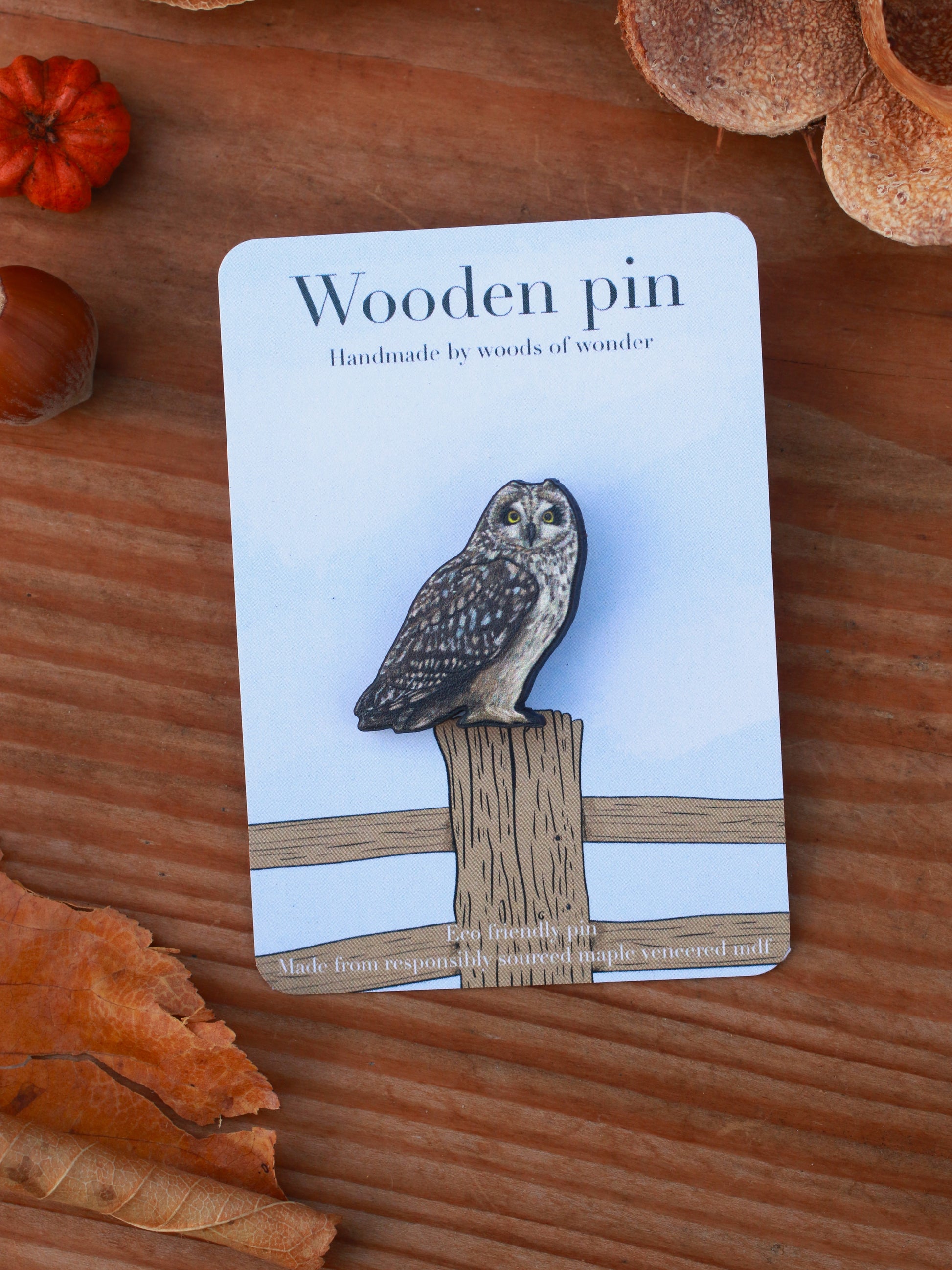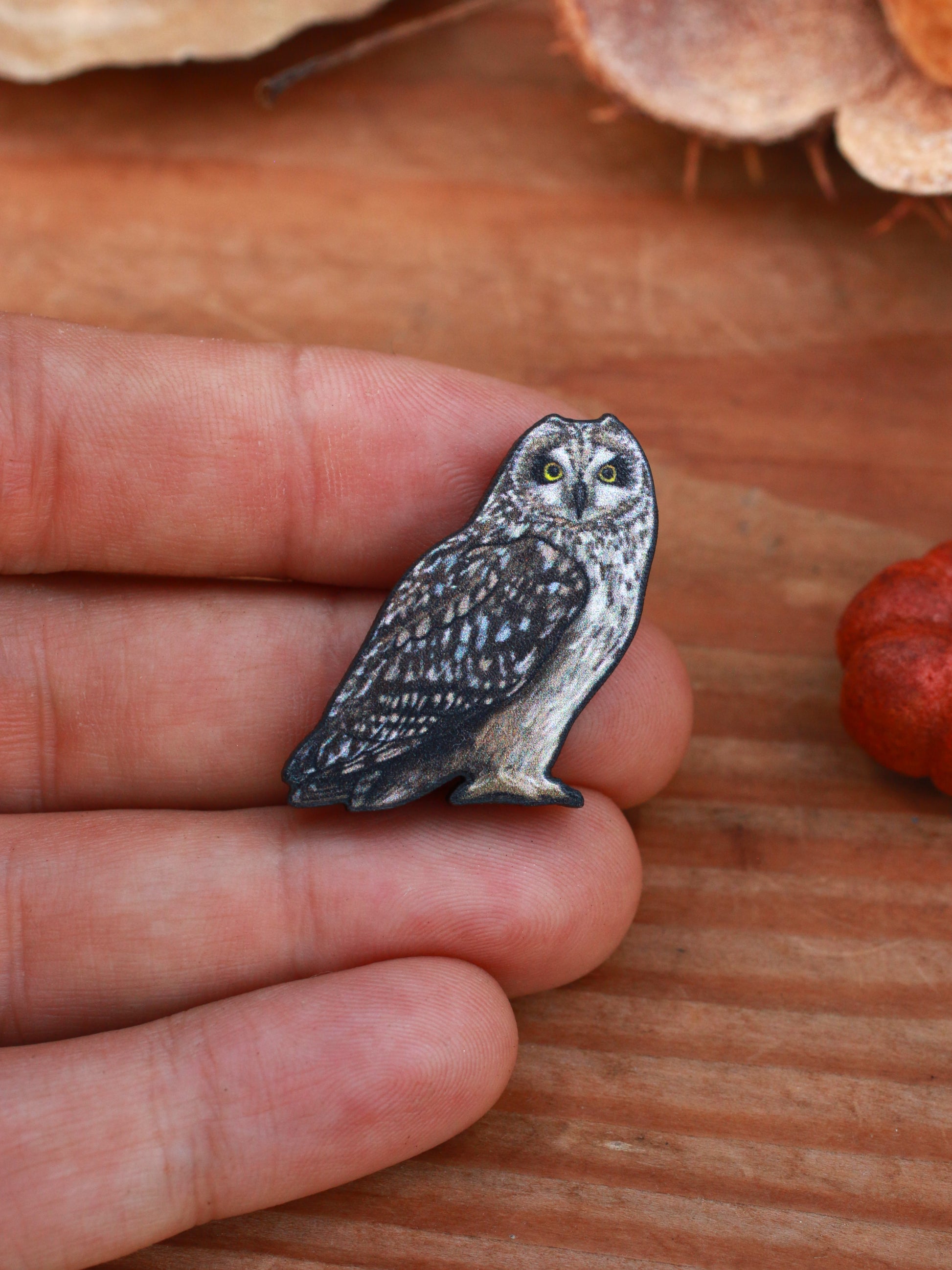 Handmade Short eared owl wooden pin