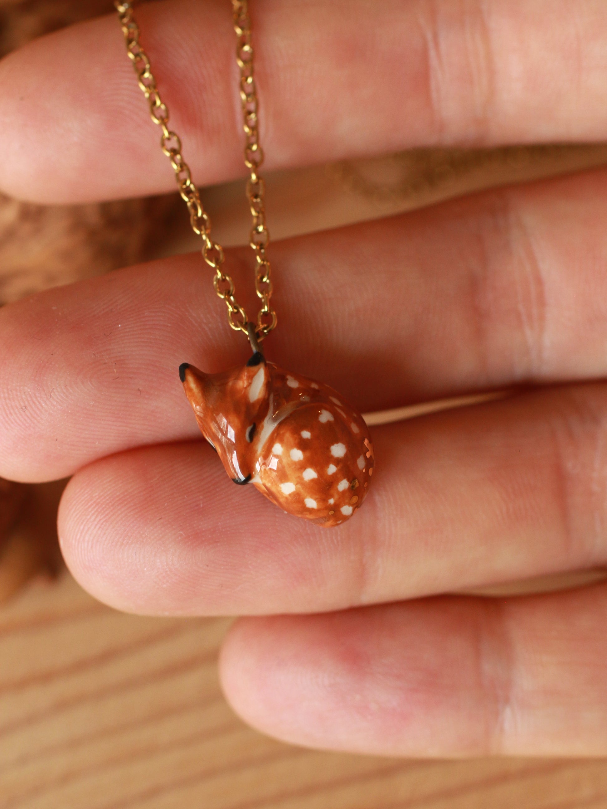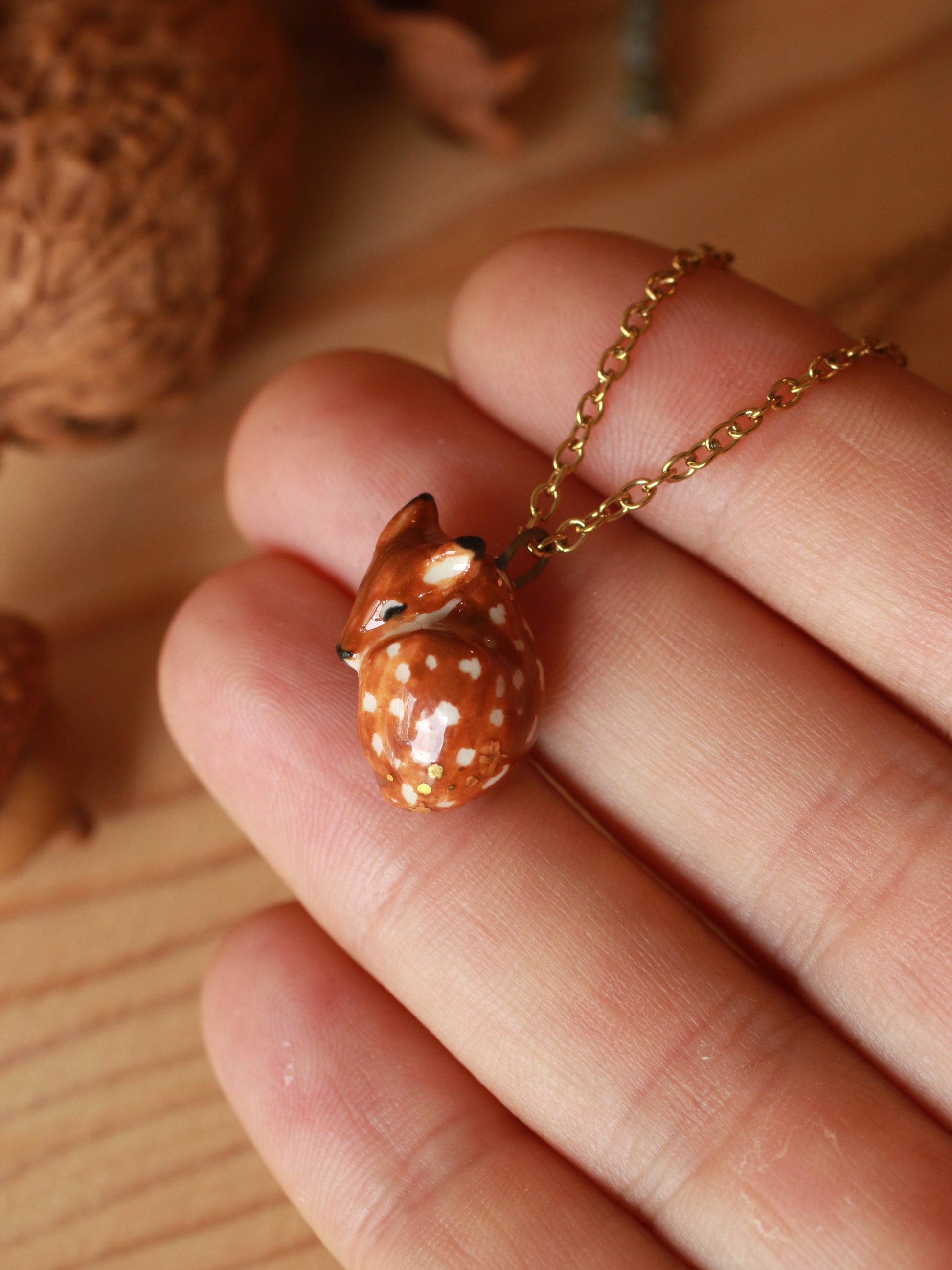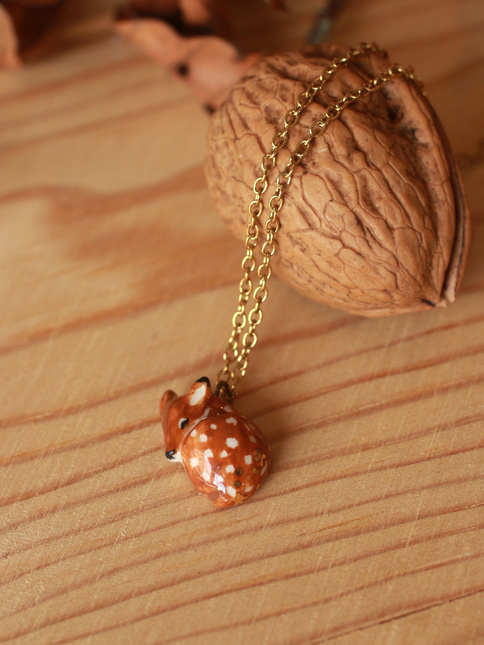 Ceramic sleeping fawn necklace in a handmade nutshell box.