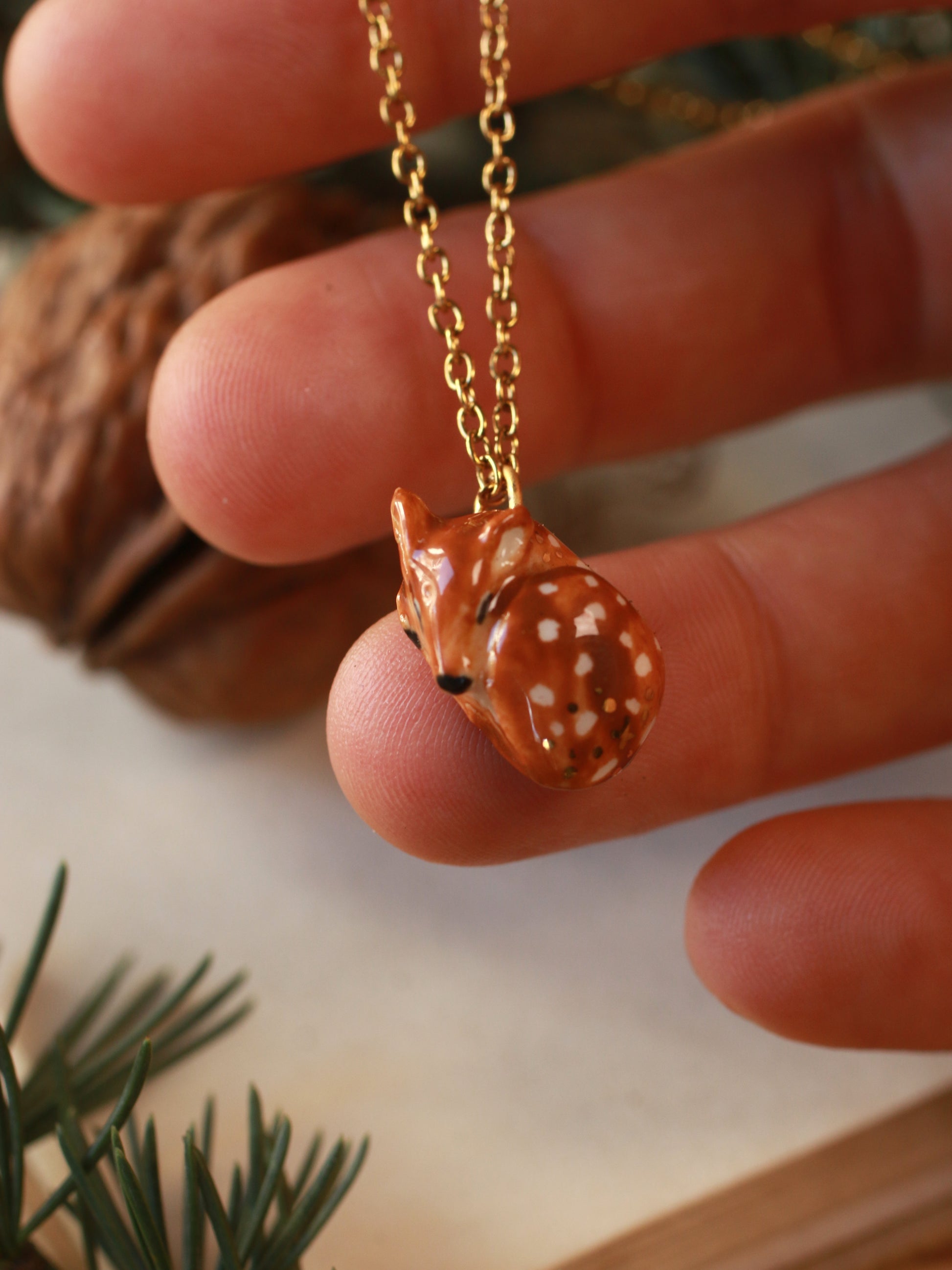 Ceramic sleeping fawn necklace in a handmade nutshell box.