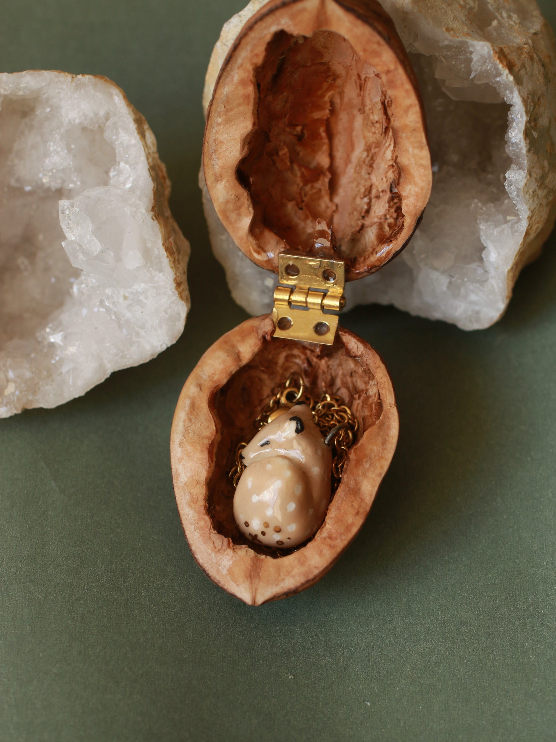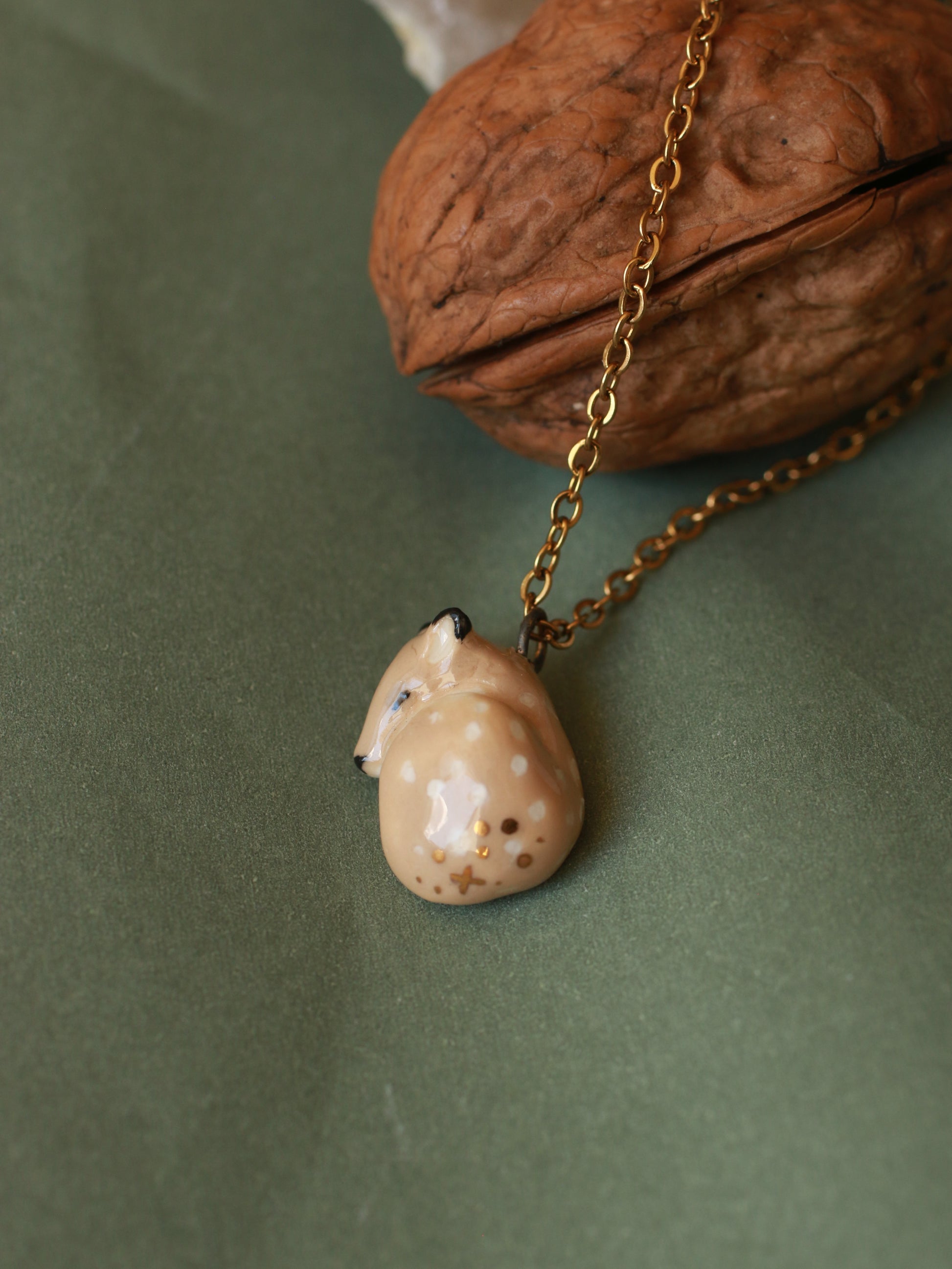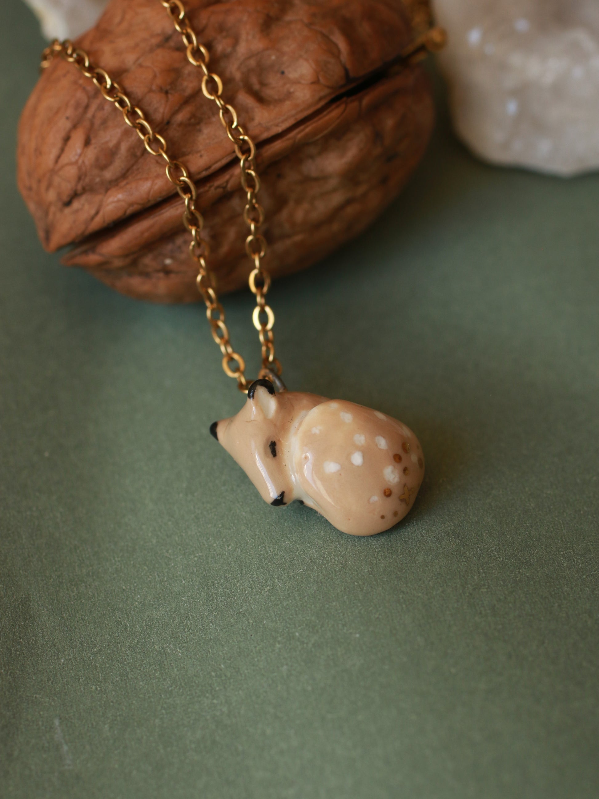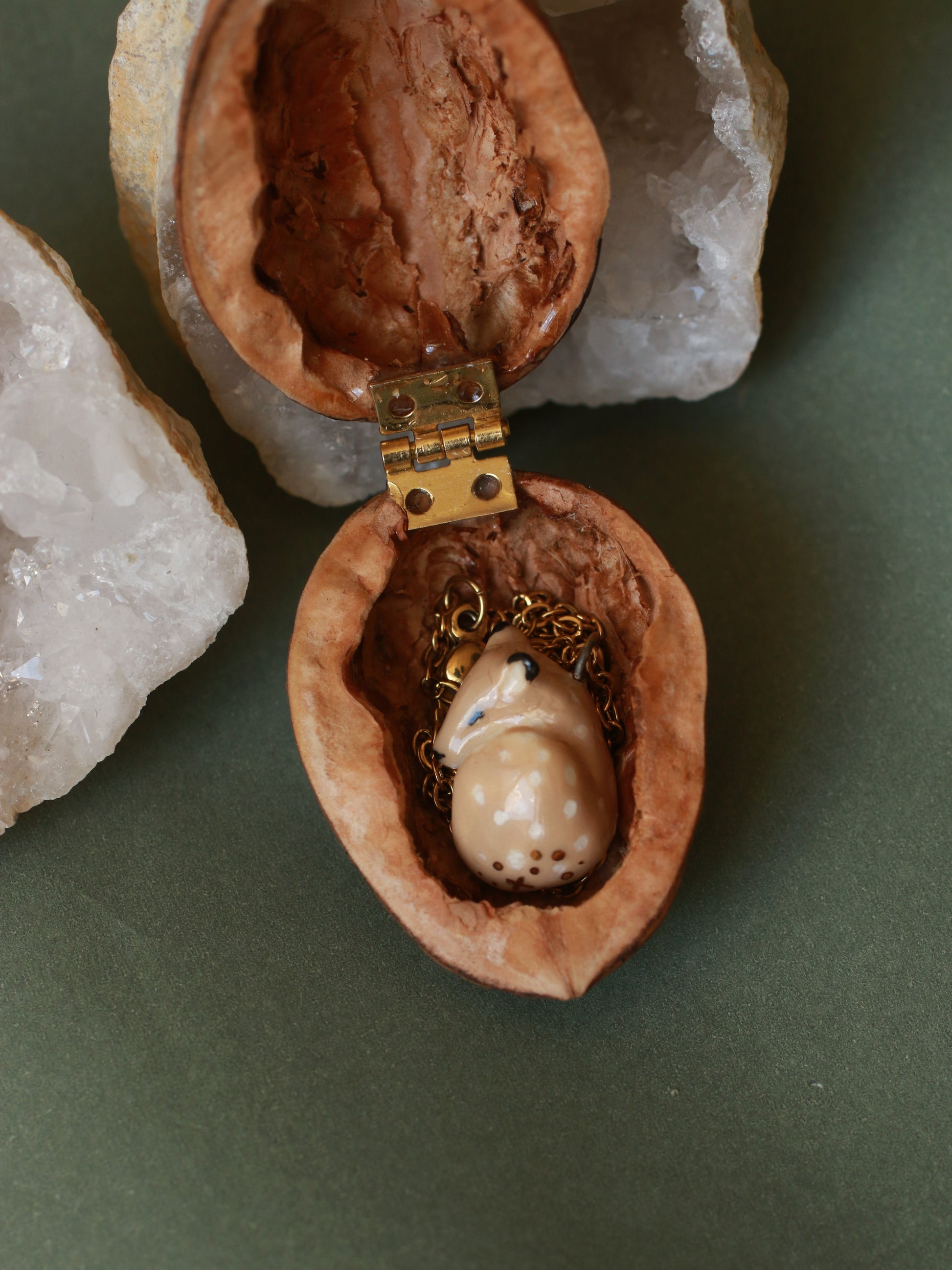 Ceramic sleeping fawn necklace in a handmade nutshell box.