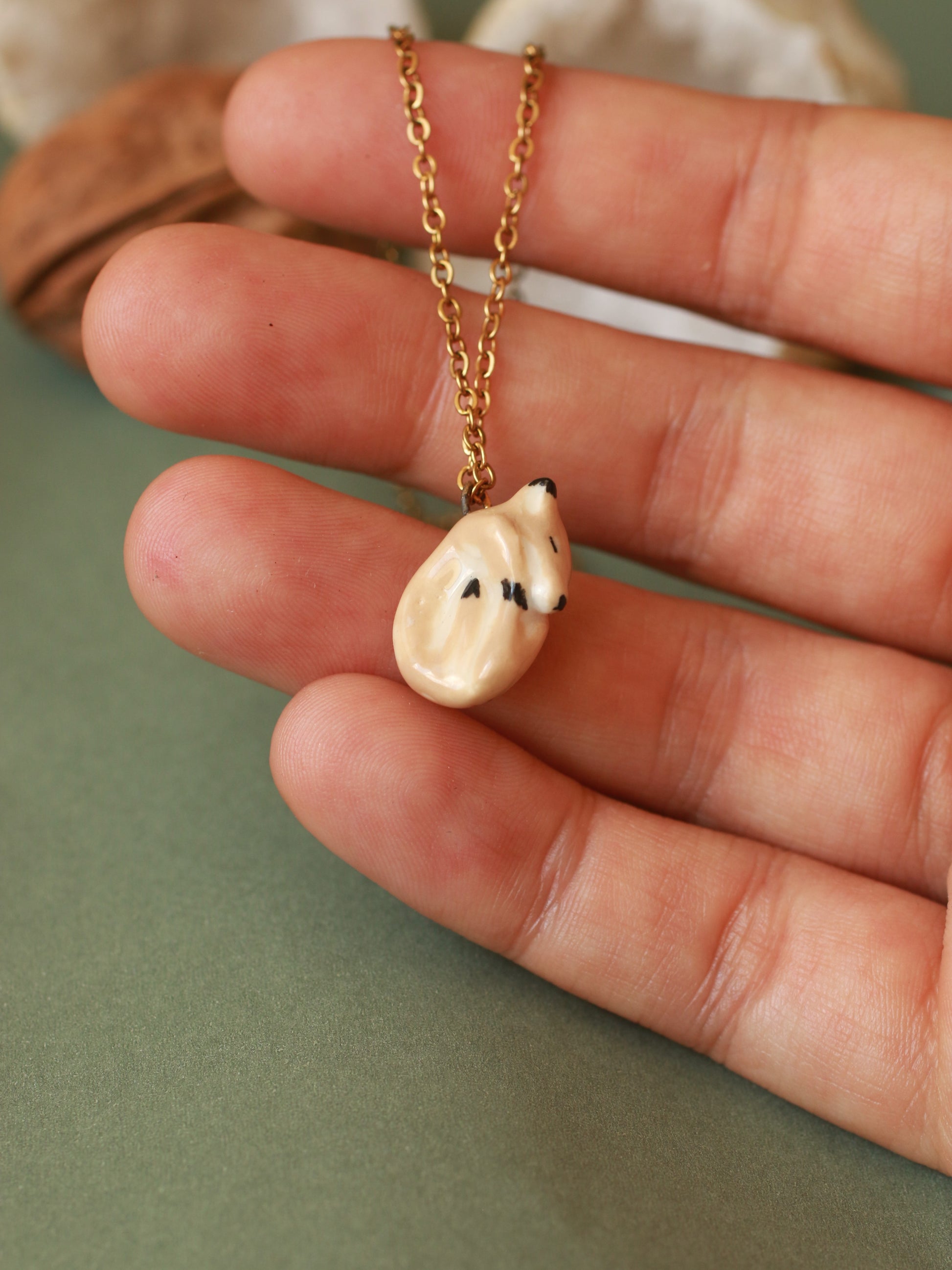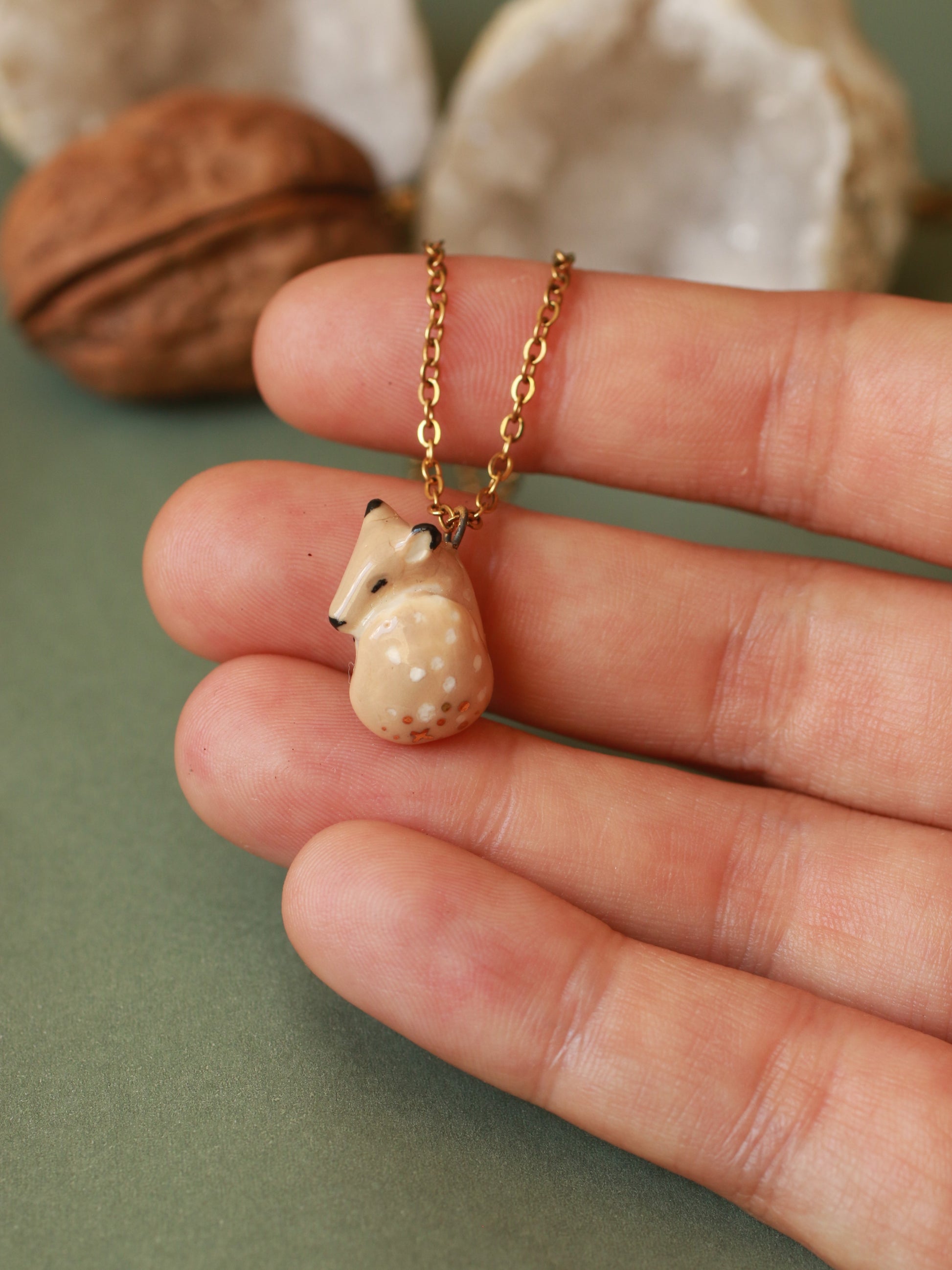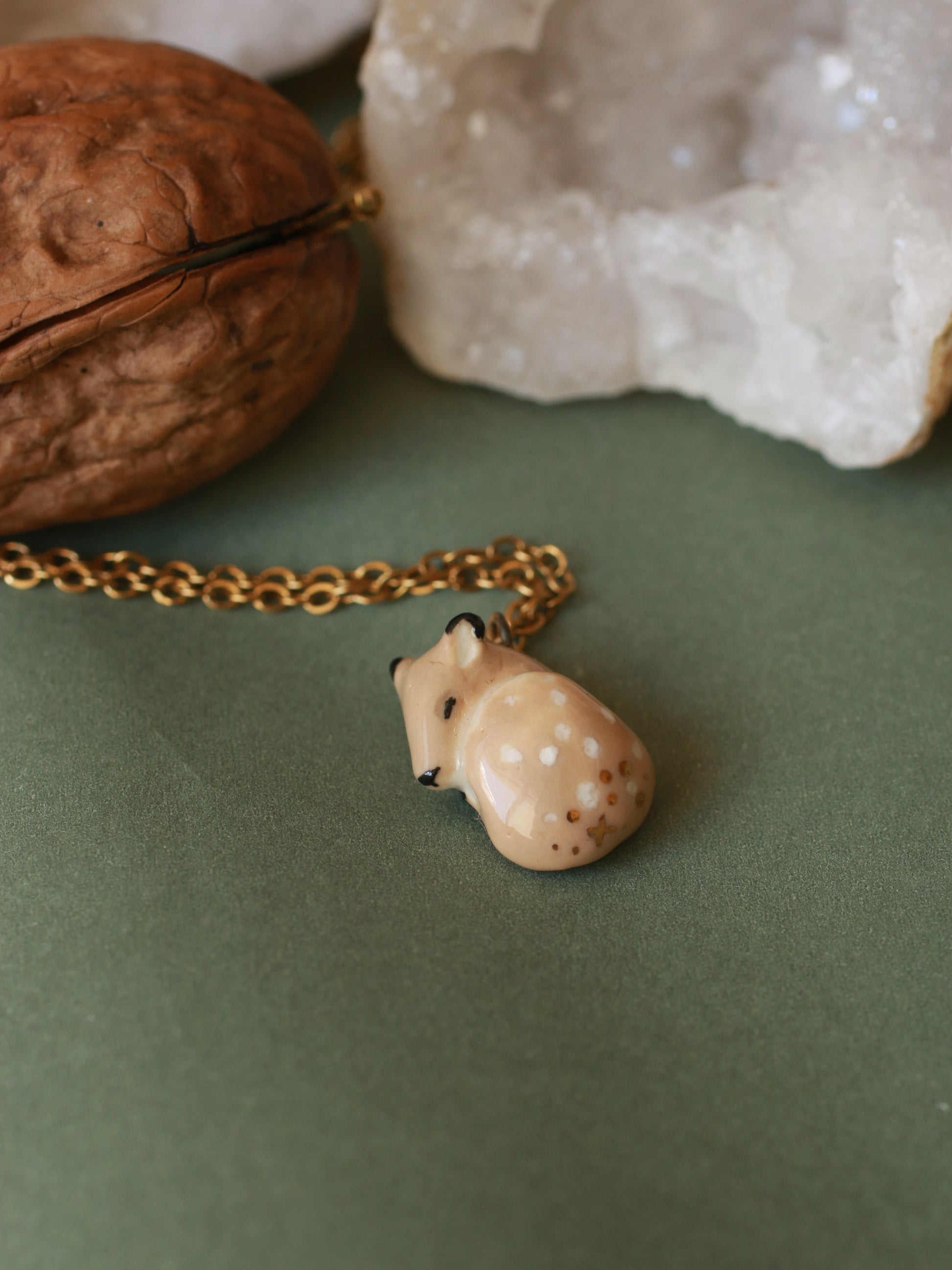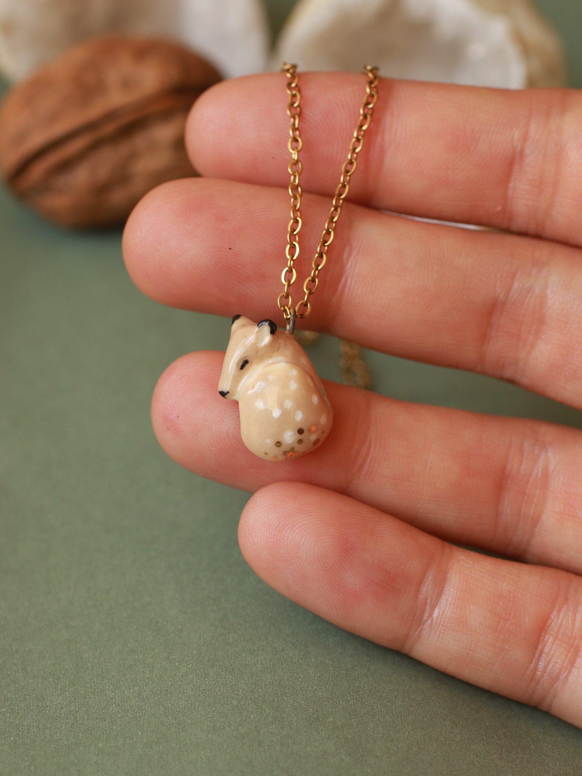 Ceramic sleeping fawn necklace in a handmade nutshell box.