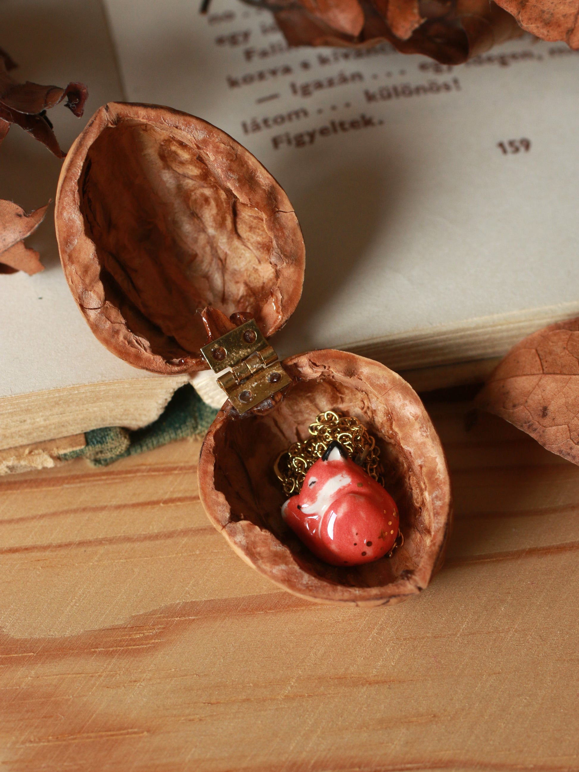 Ceramic Sleeping fox necklace in a handmade nutshell box.