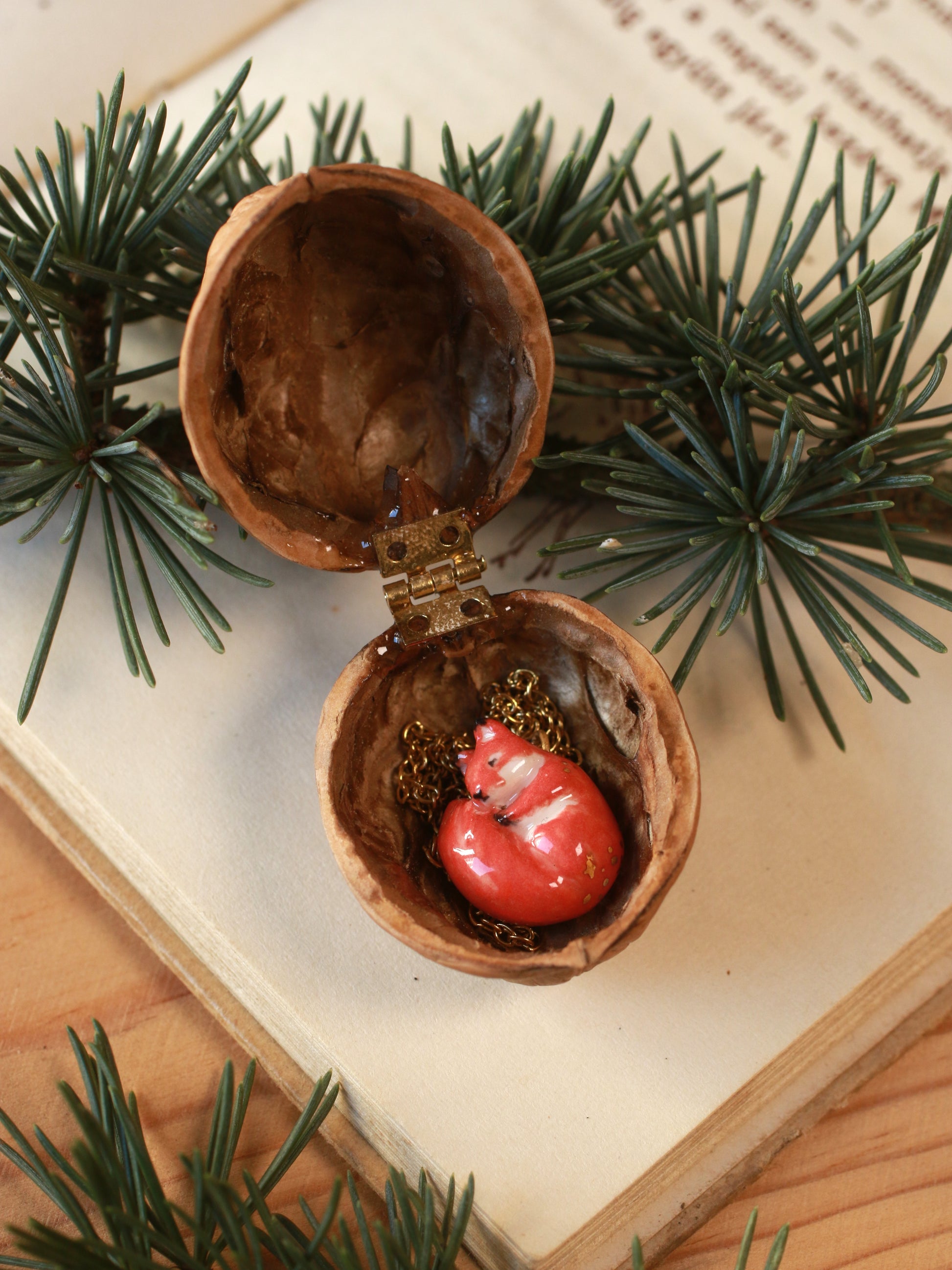 Ceramic Sleeping squirrel necklace in a handmade nutshell box.
