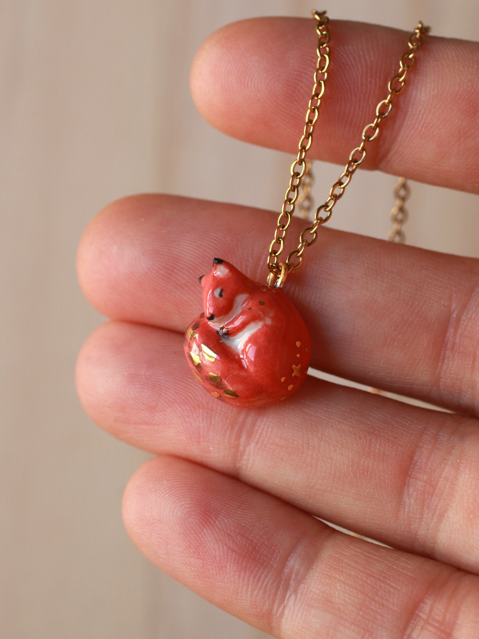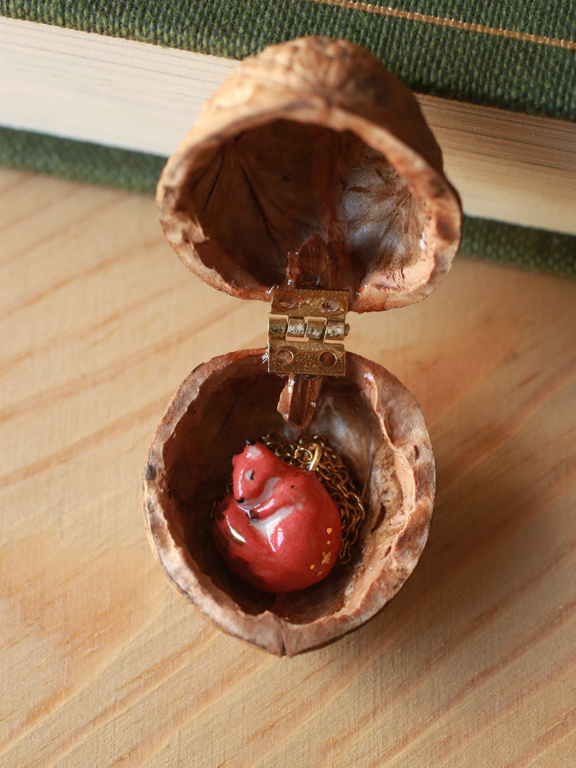 Ceramic Sleeping squirrel necklace in a handmade nutshell box.