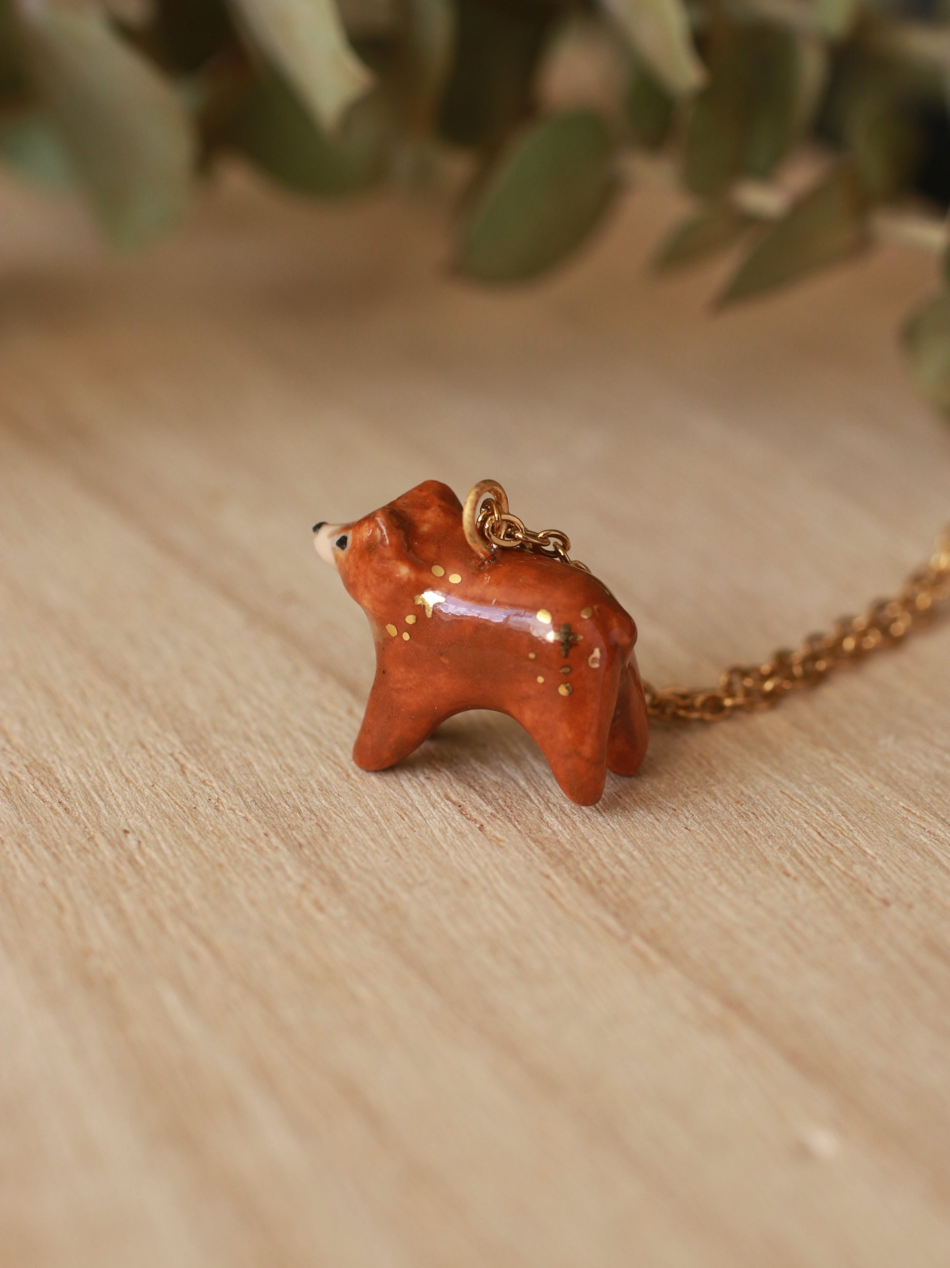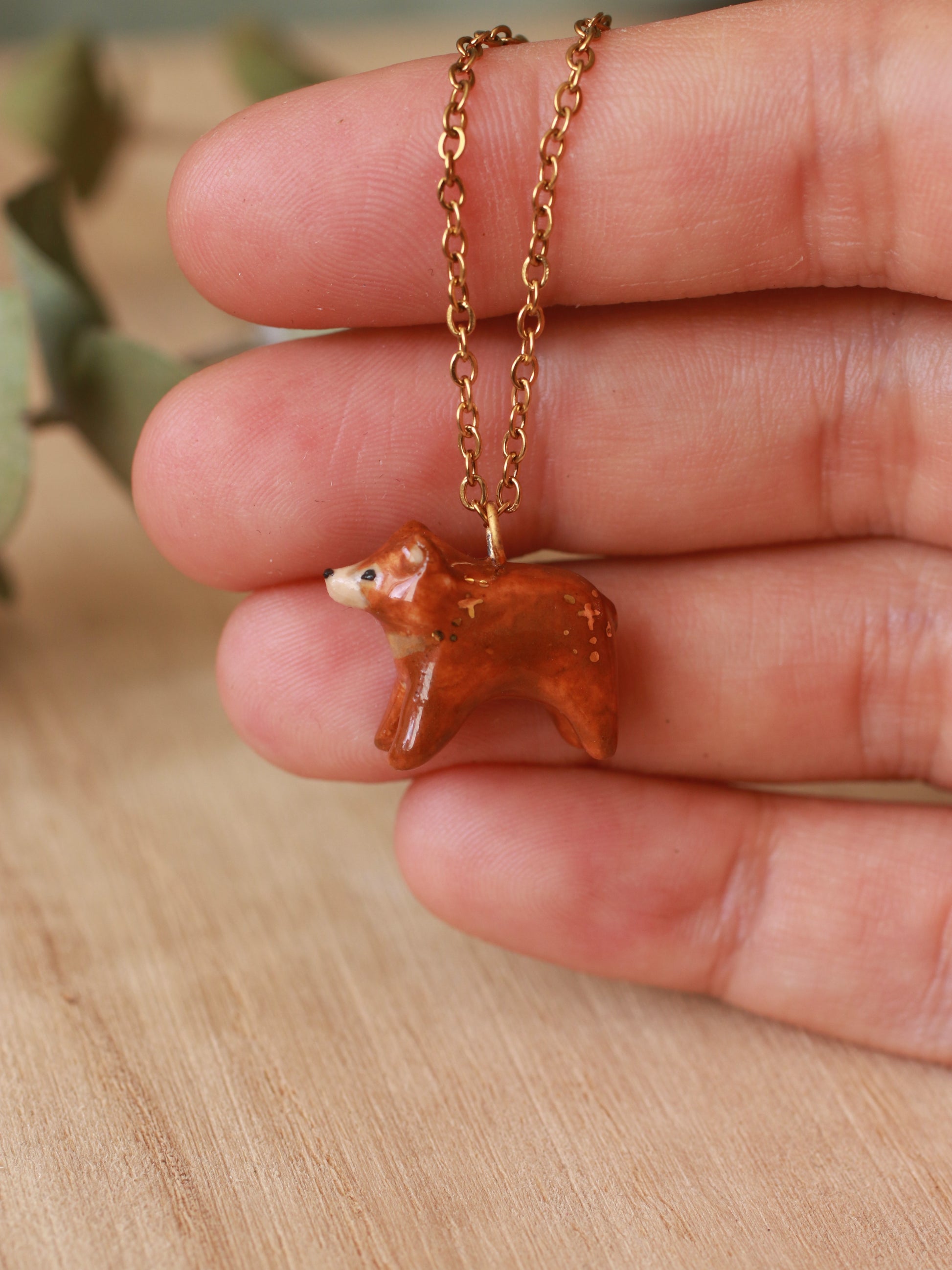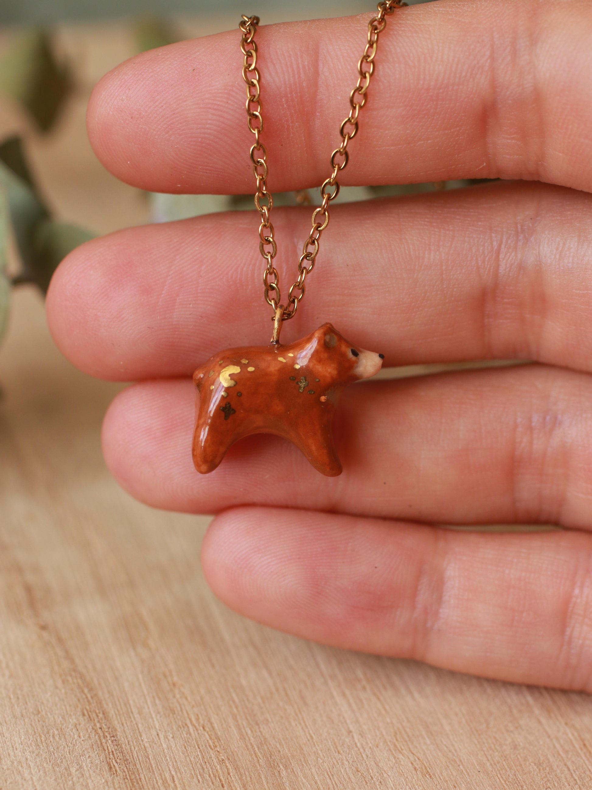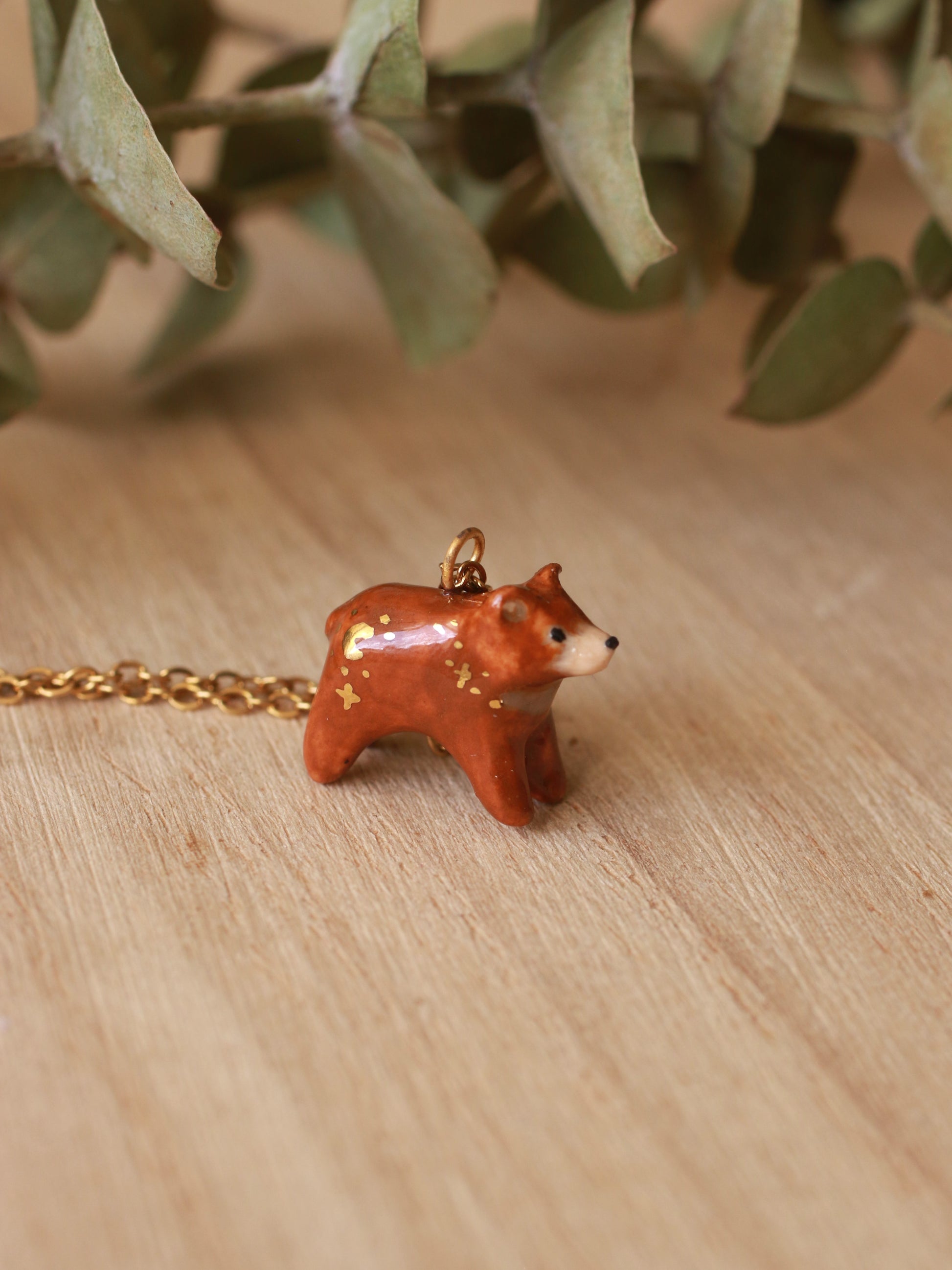 Tiny brown Bear necklace - with gold luster details