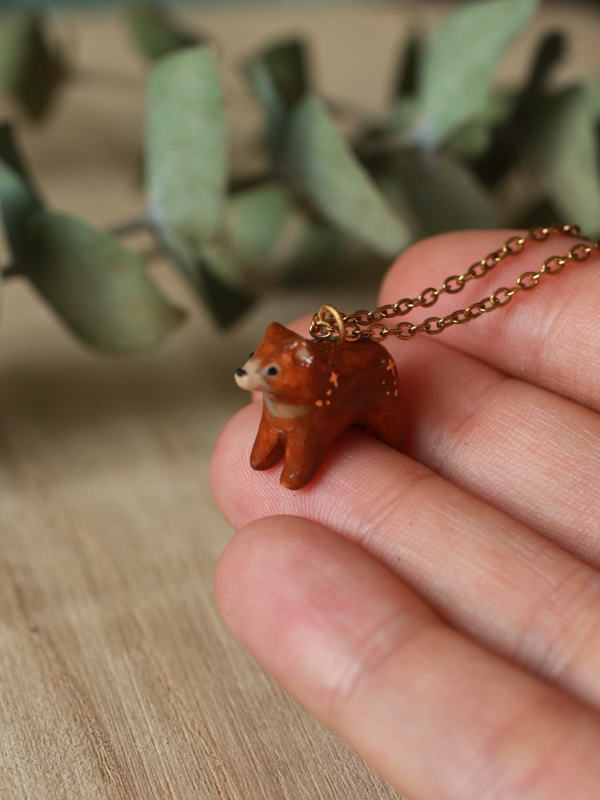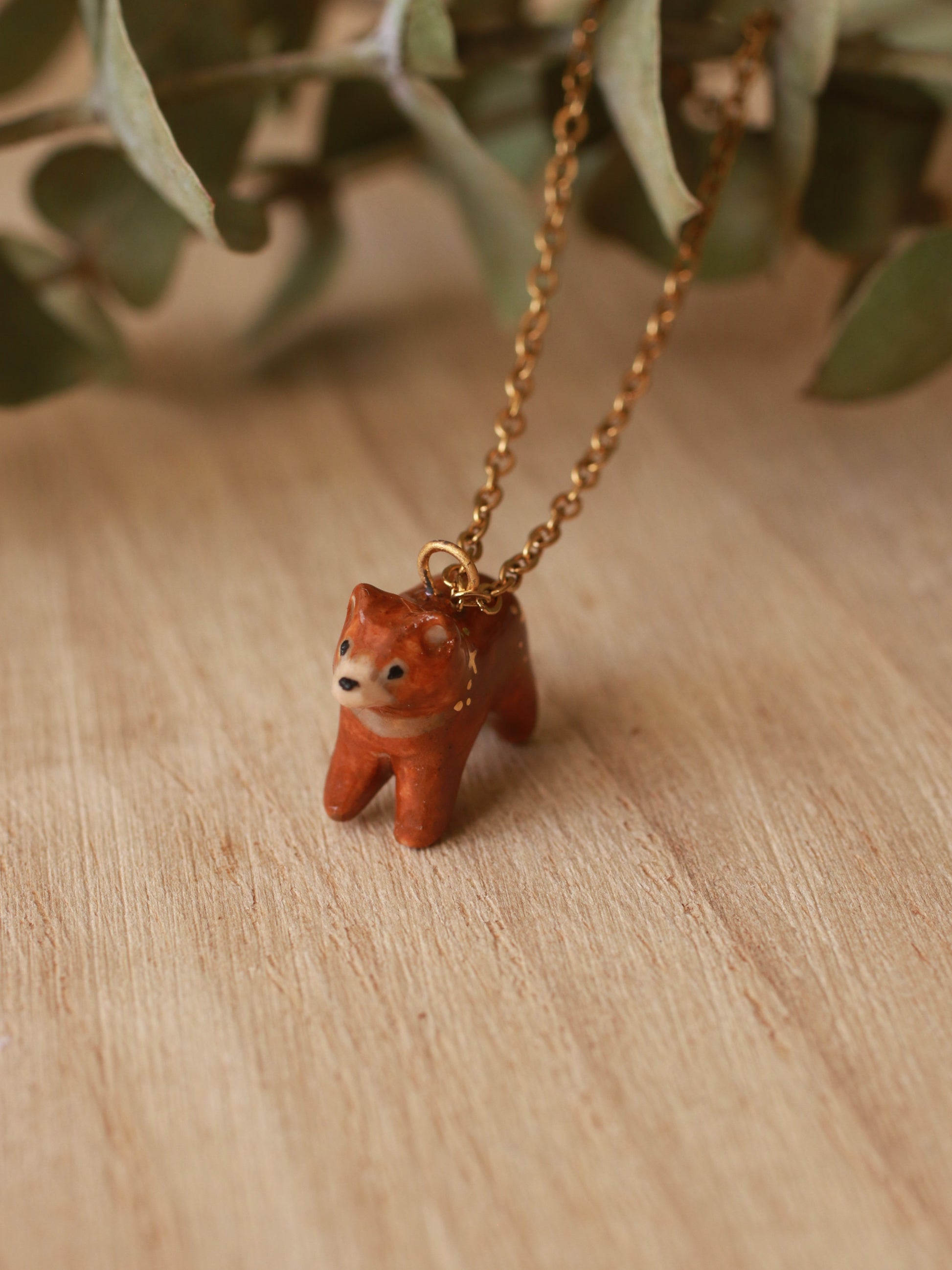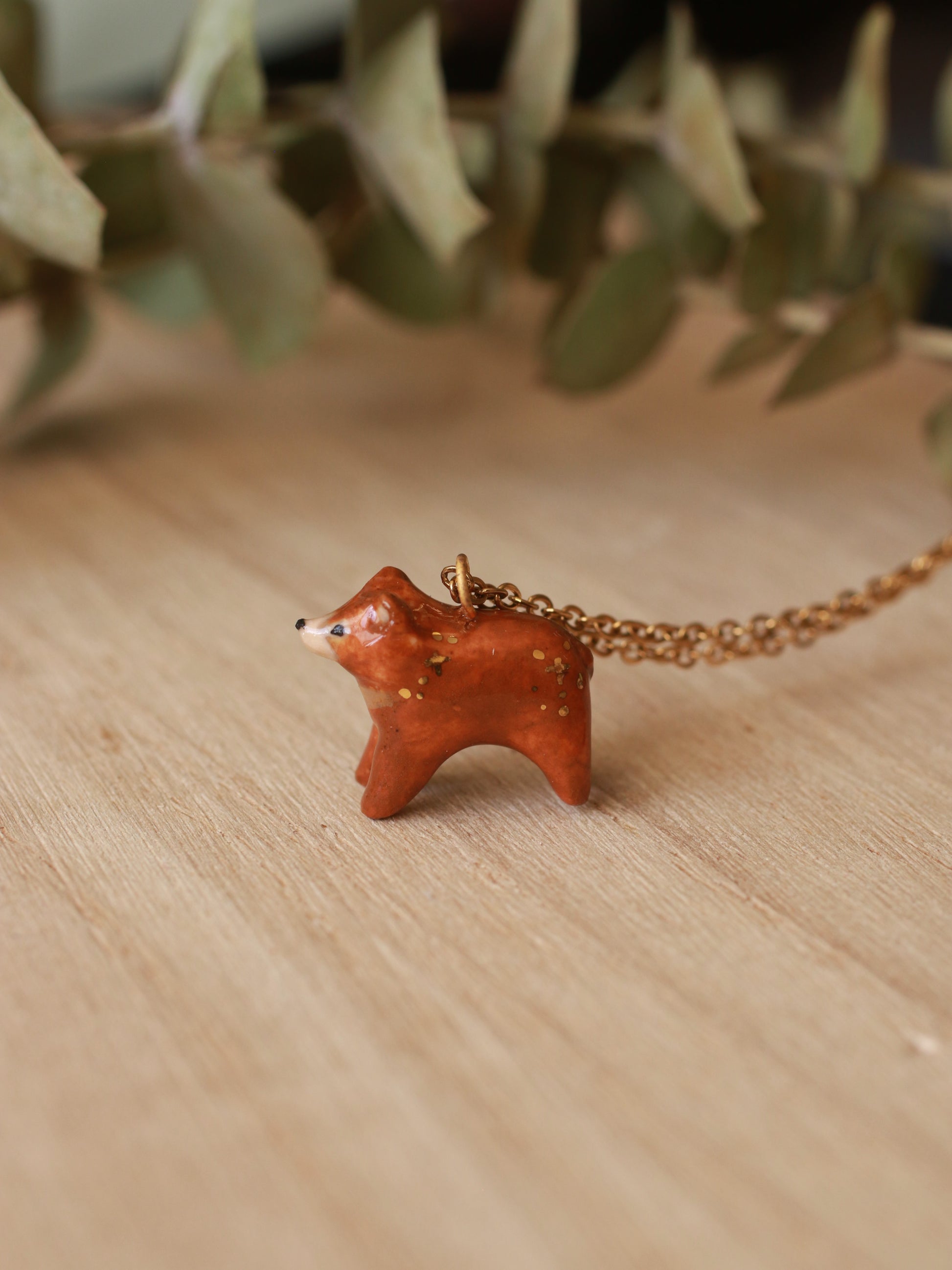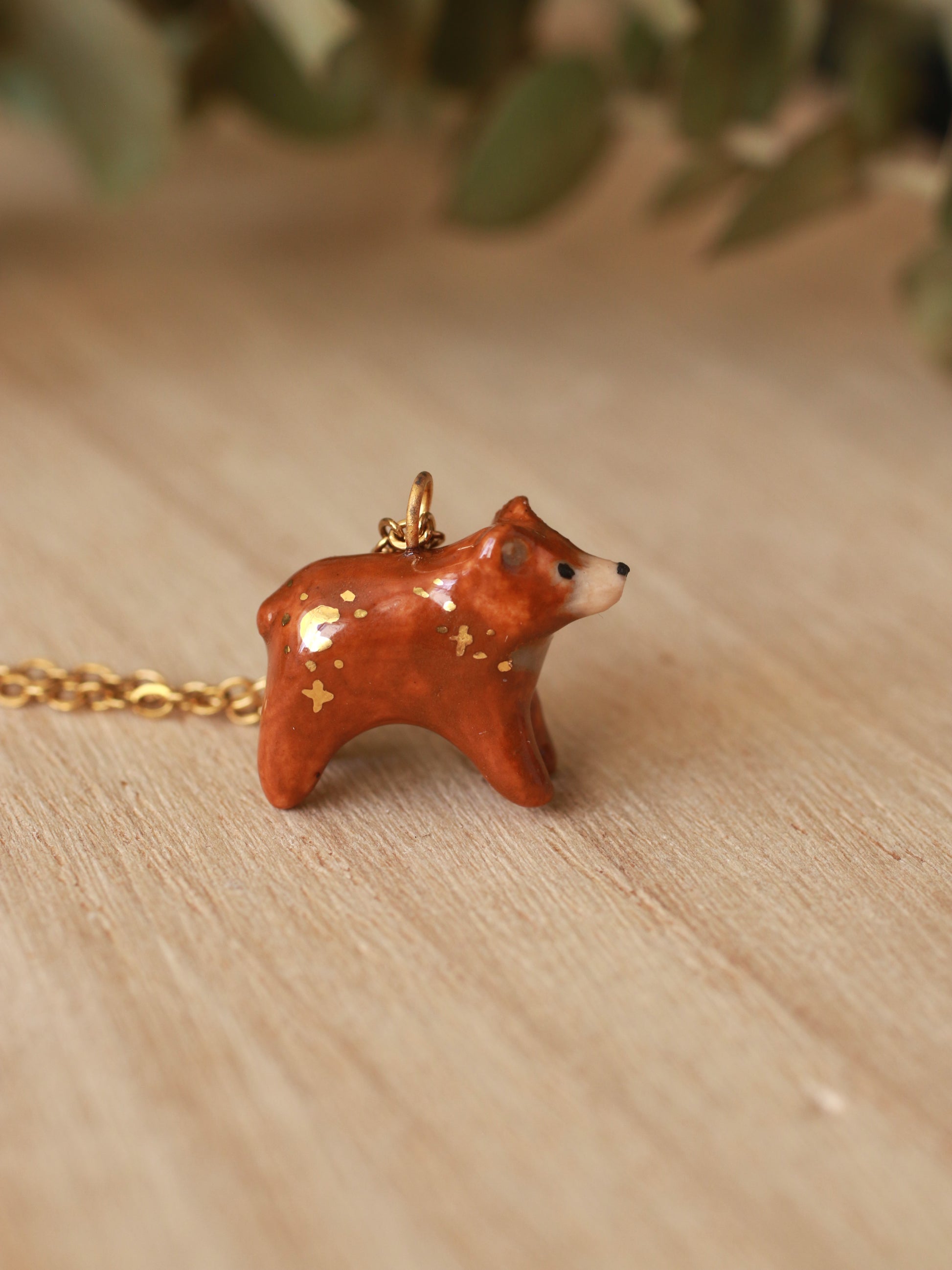 Tiny brown Bear necklace - with gold luster details
